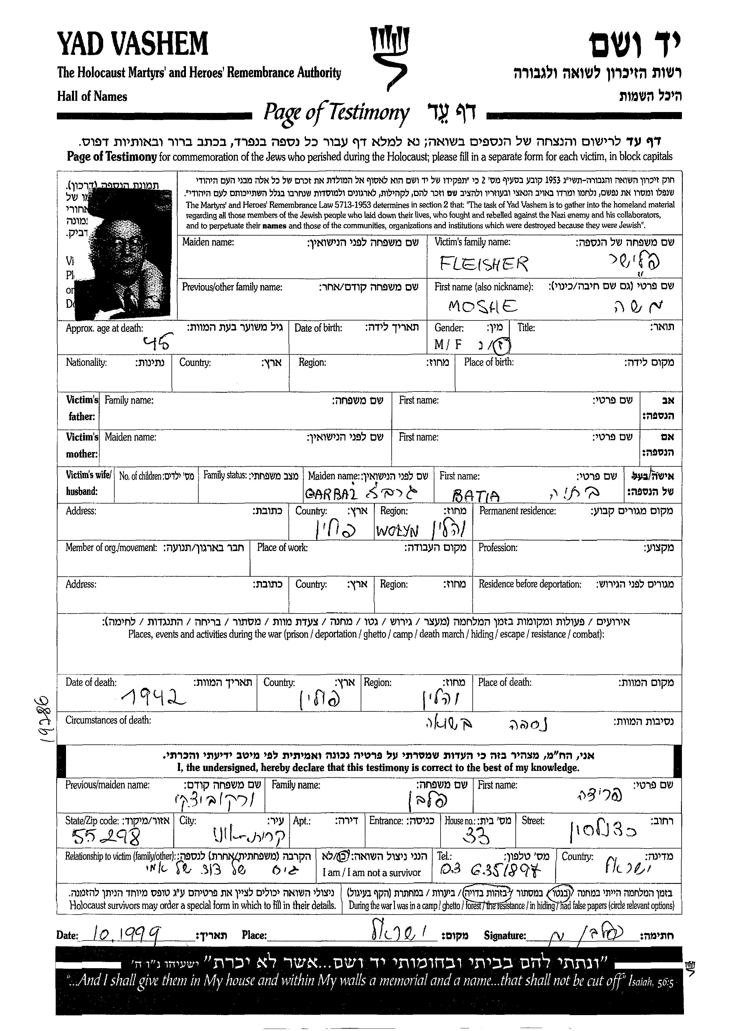 Moshe Felisher Fleisher. Avant la seconde guerre mondiale il vivait à Wolyn, Pologne.