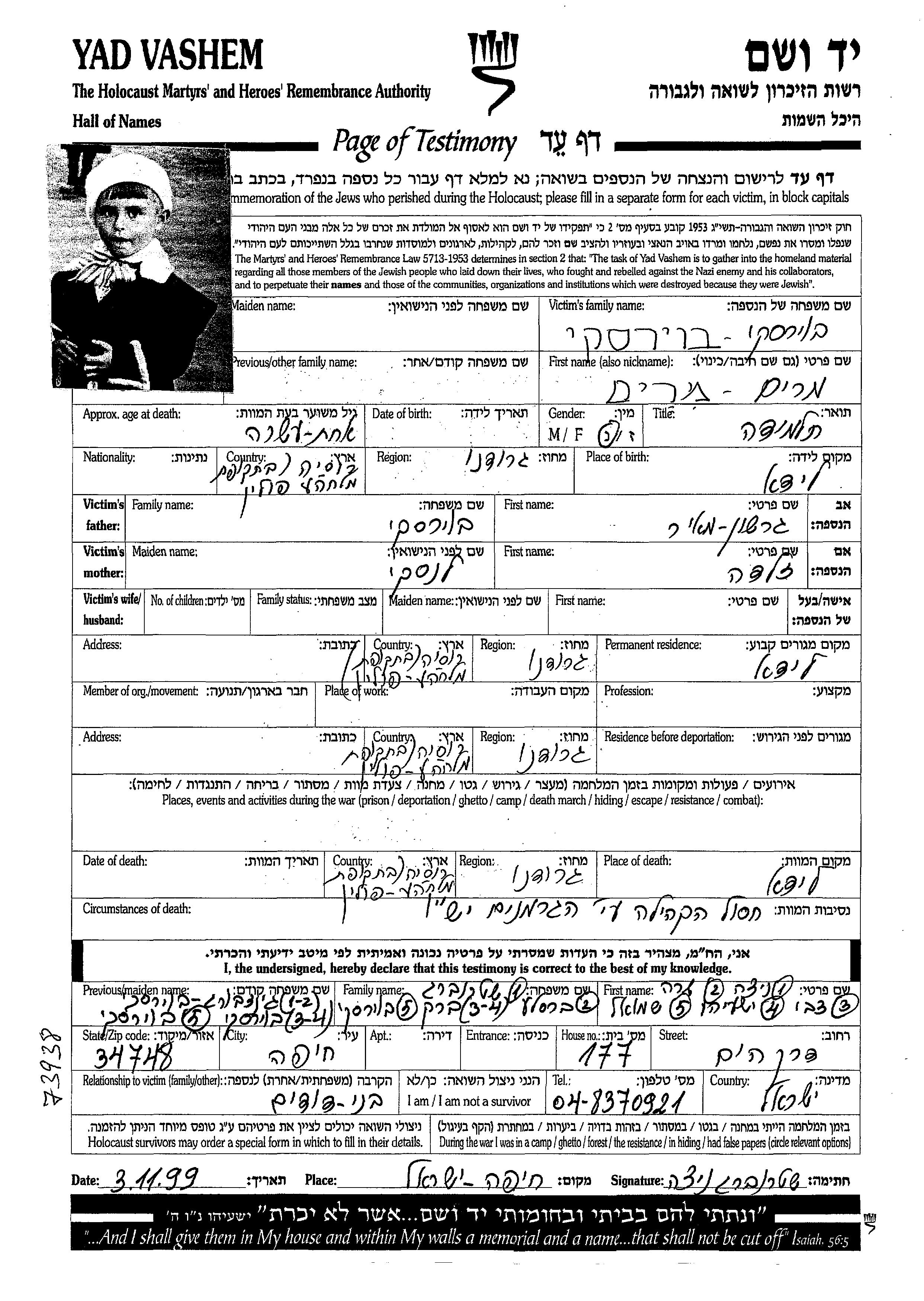 Yad Vashem - Pages of Testimony Names Memorial Collection