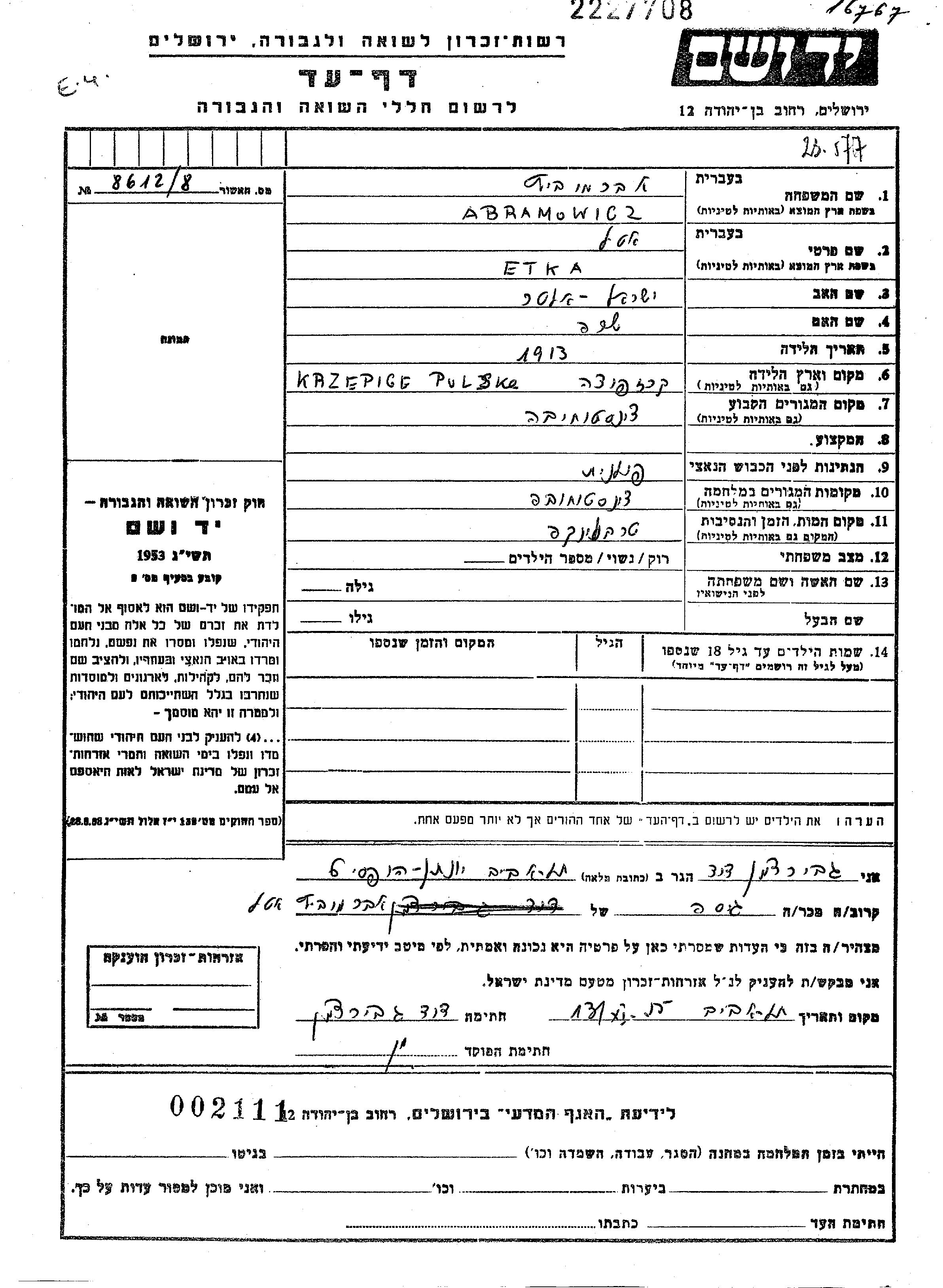 Abramovitz Etka 1911 Czestochowa, Pologne Feuille de témoignage