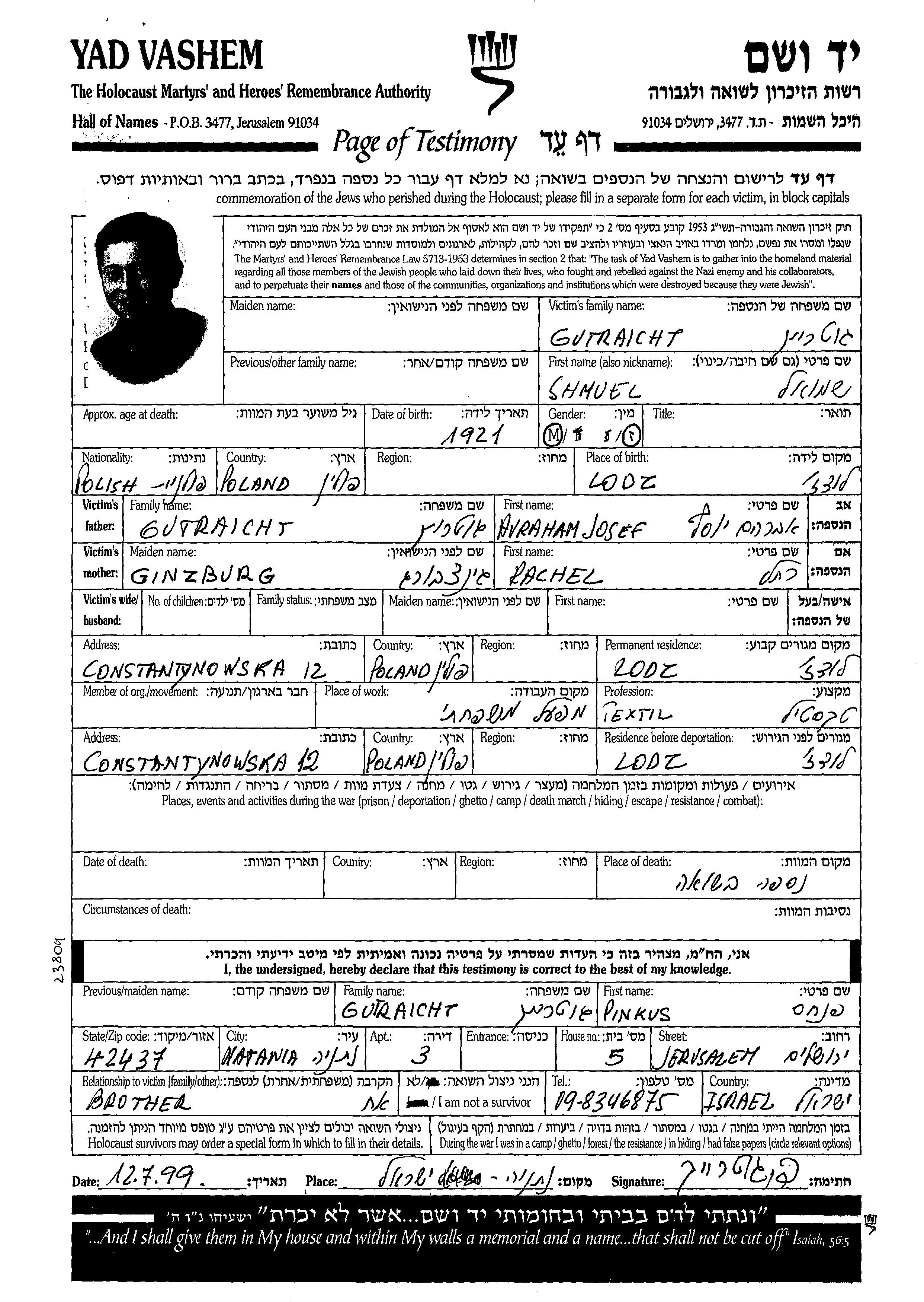 | Gutraicht Gutreikh | Shmuel | 1921 | Lodz, Pologne | Feuille de témoignage |