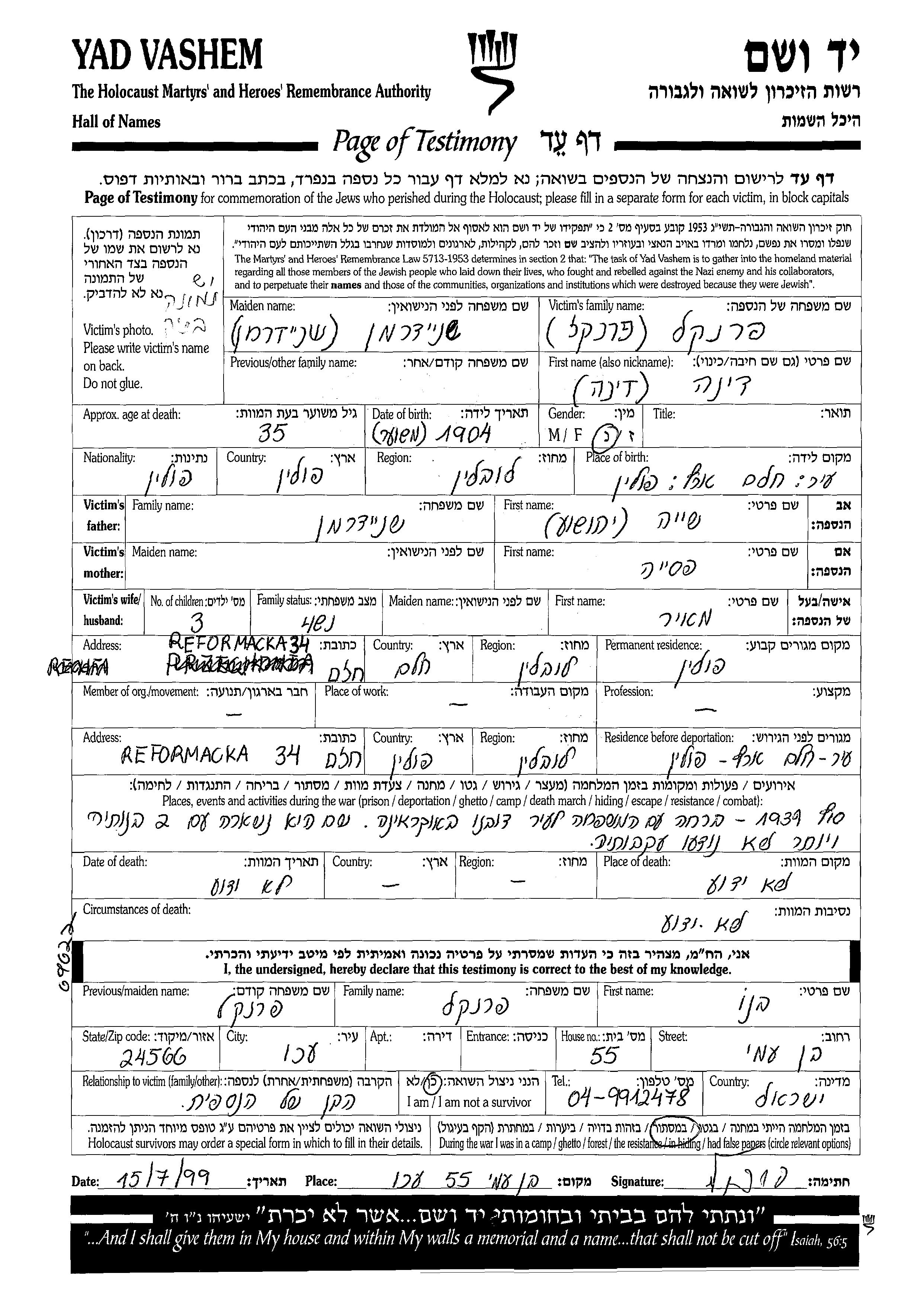 Yad Vashem - Pages of Testimony Names Memorial Collection