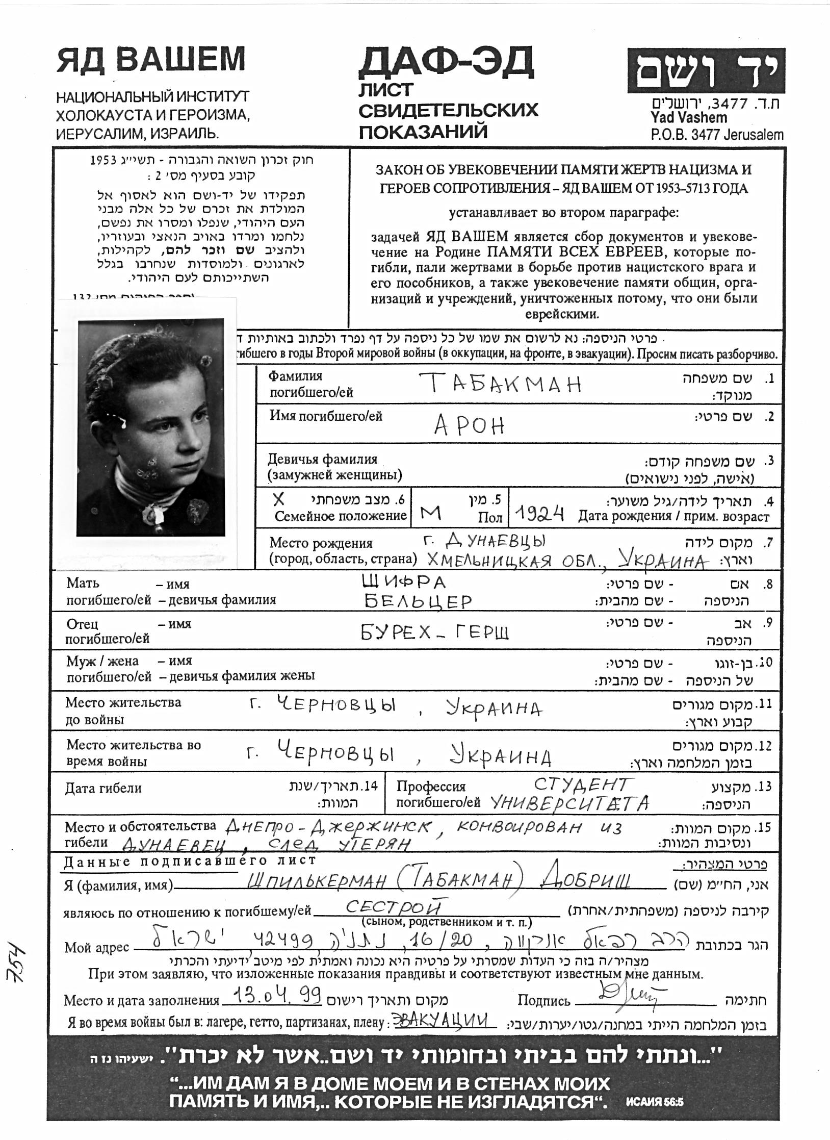 Tabakman Aron 1924 Chernovtsy, Ukraine (URSS) Feuille de témoignage