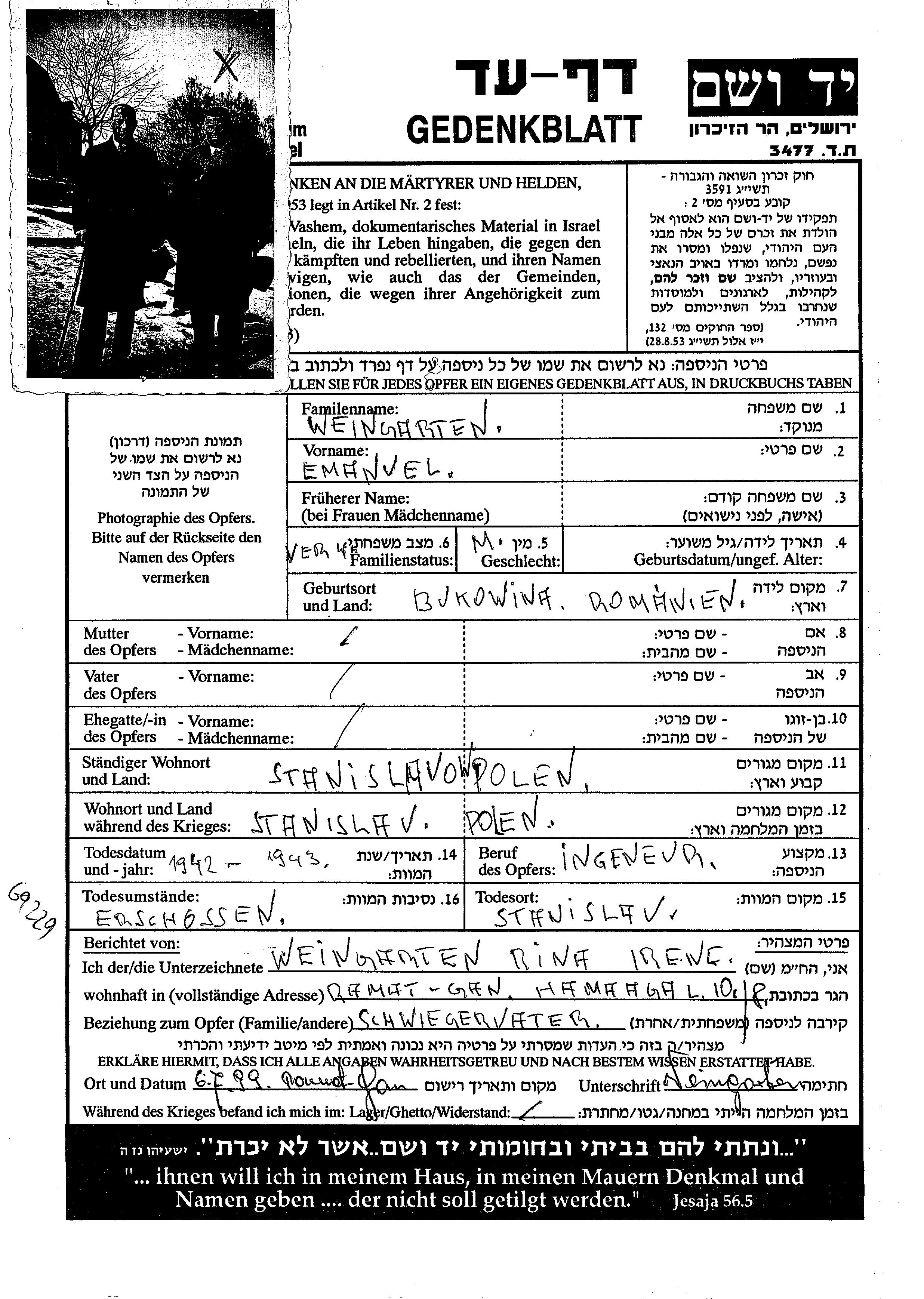 Emanuel Weingarten est né à Bukovina, Roumanie. Il était Ingénieur. Avant la seconde guerre mondiale il vivait à Stanislawow, Pologne.