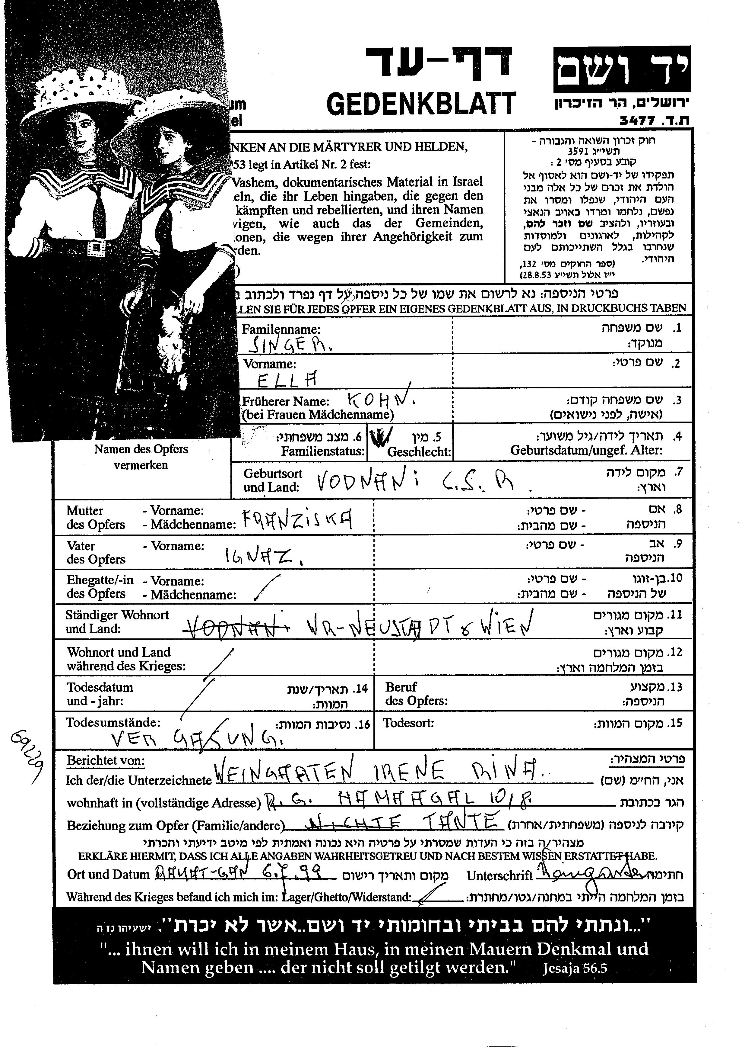 Ella Singer née Kohn est née à Vodnany, Tchécoslovaquie. Avant la seconde guerre mondiale elle vivait à Wien, Autriche.