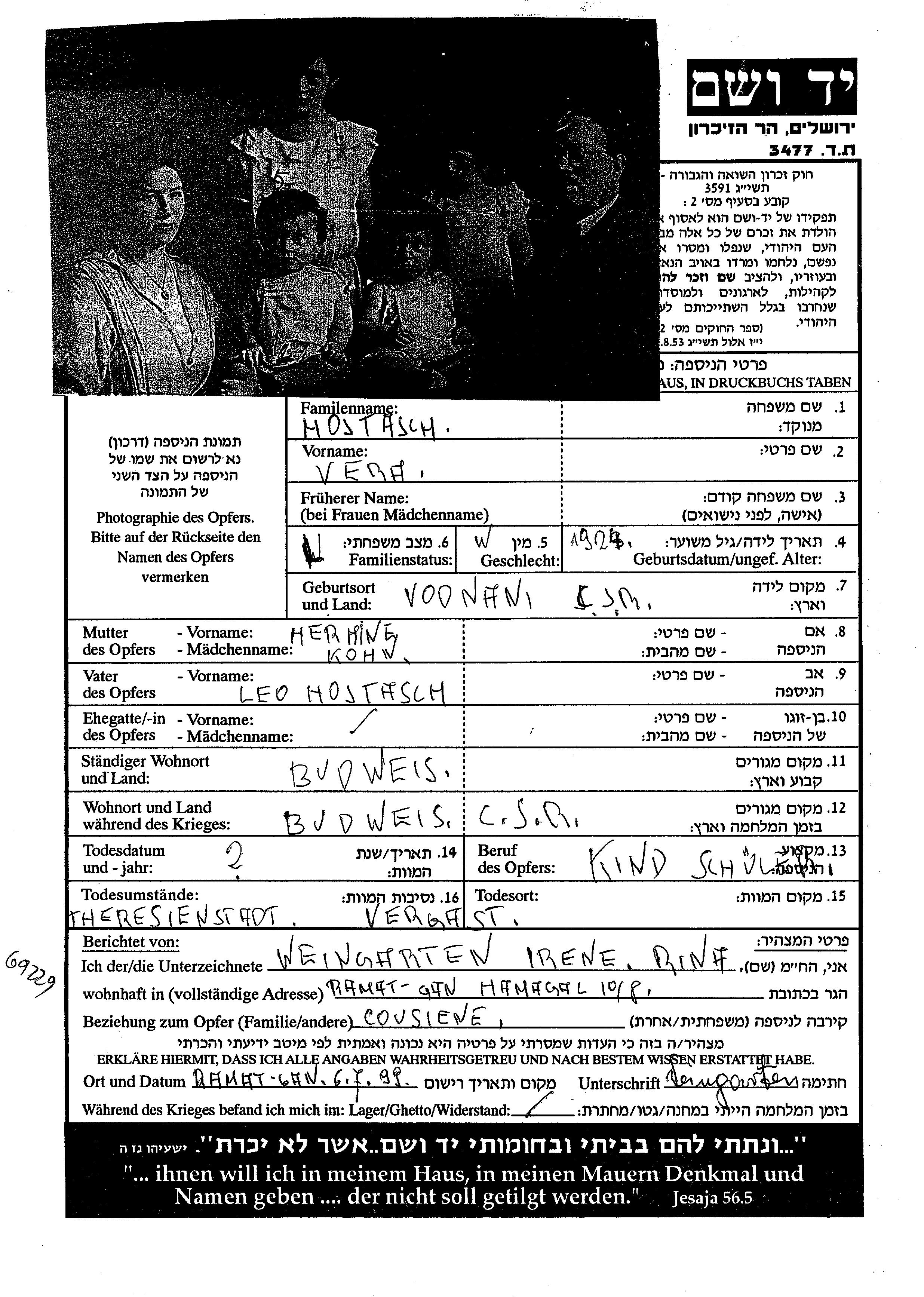 Hojtasch Vera 1924 Budweis, Tchécoslovaquie Feuille de témoignage
