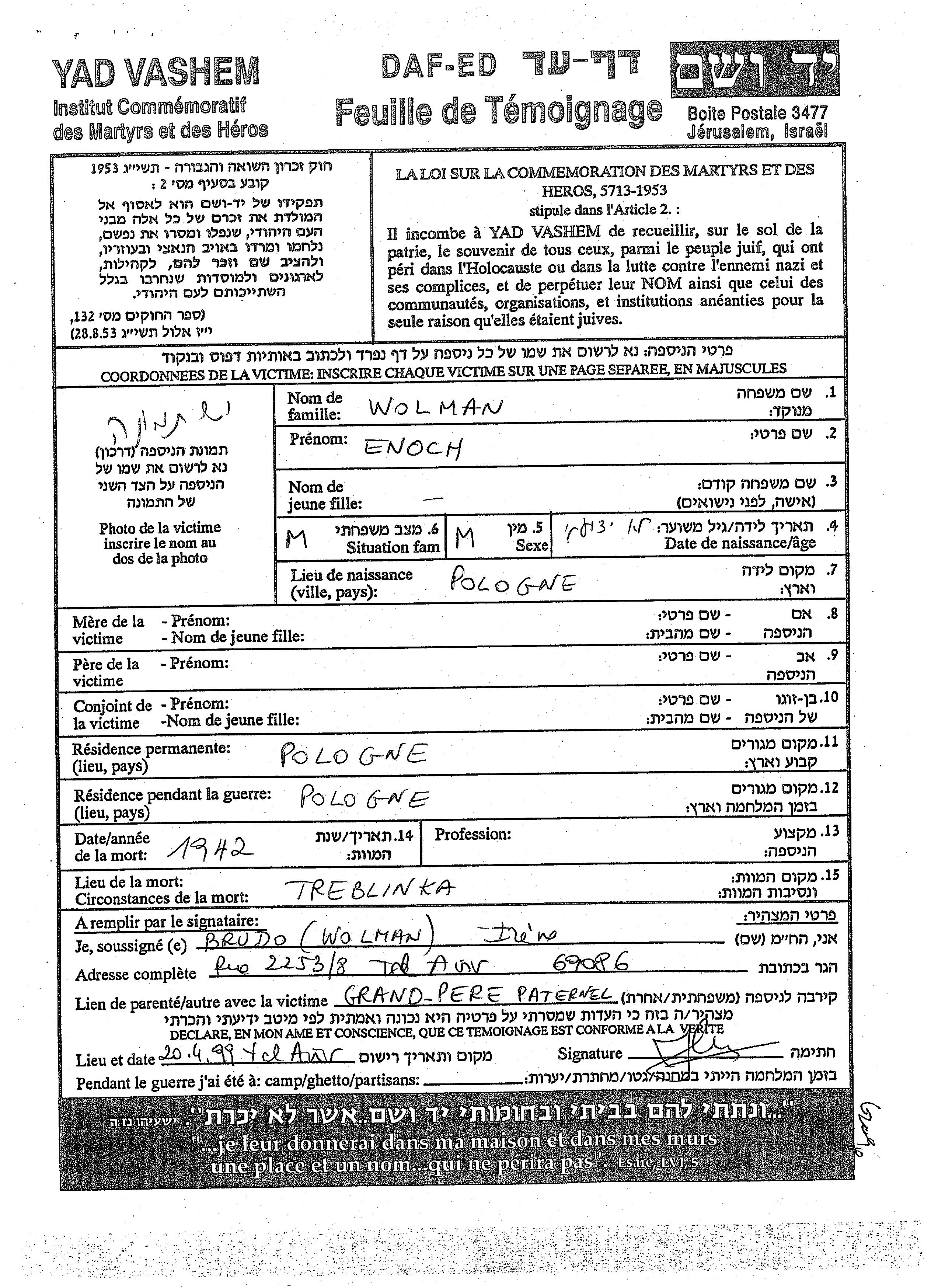 Enoch Wolman est né à Pologne. Avant la seconde guerre mondiale il vivait à Pologne.