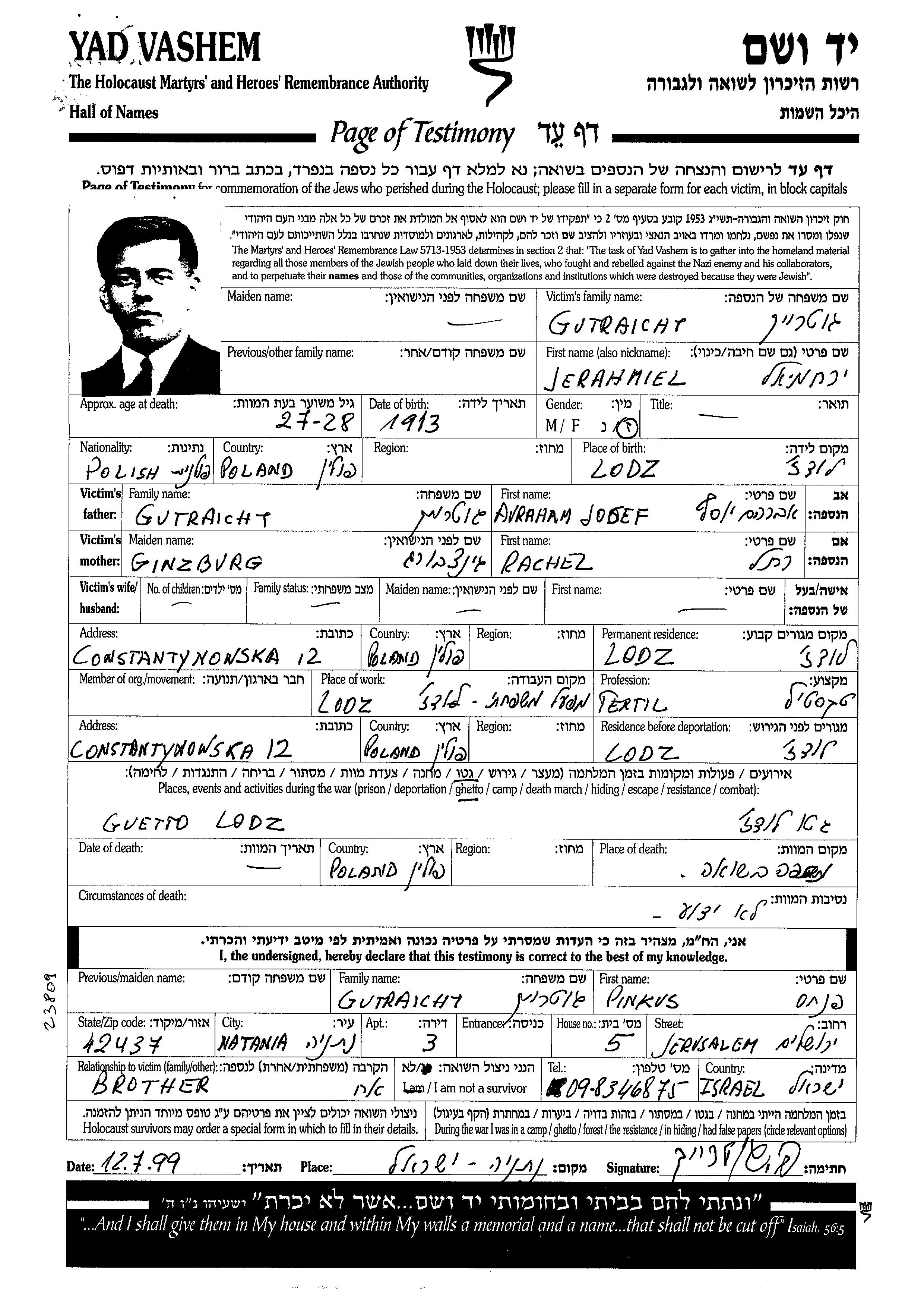 Gutraicht Gutreikh Jerahmiel 1913 Lodz, Pologne Feuille de témoignage
