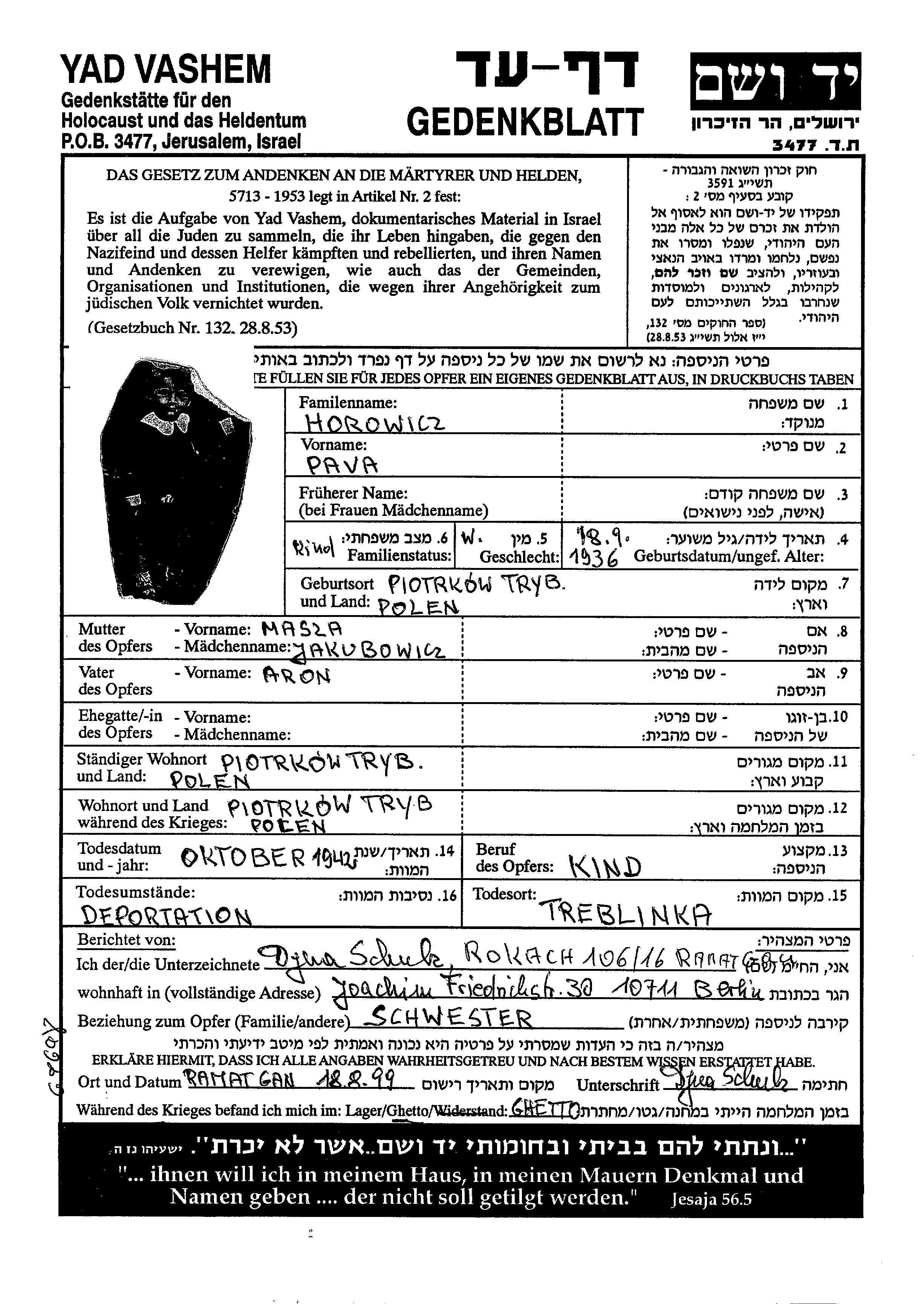 Horowicz | Pava | 1936 | Piotrkow Trybunalski, Pologne | Feuille de témoignage |