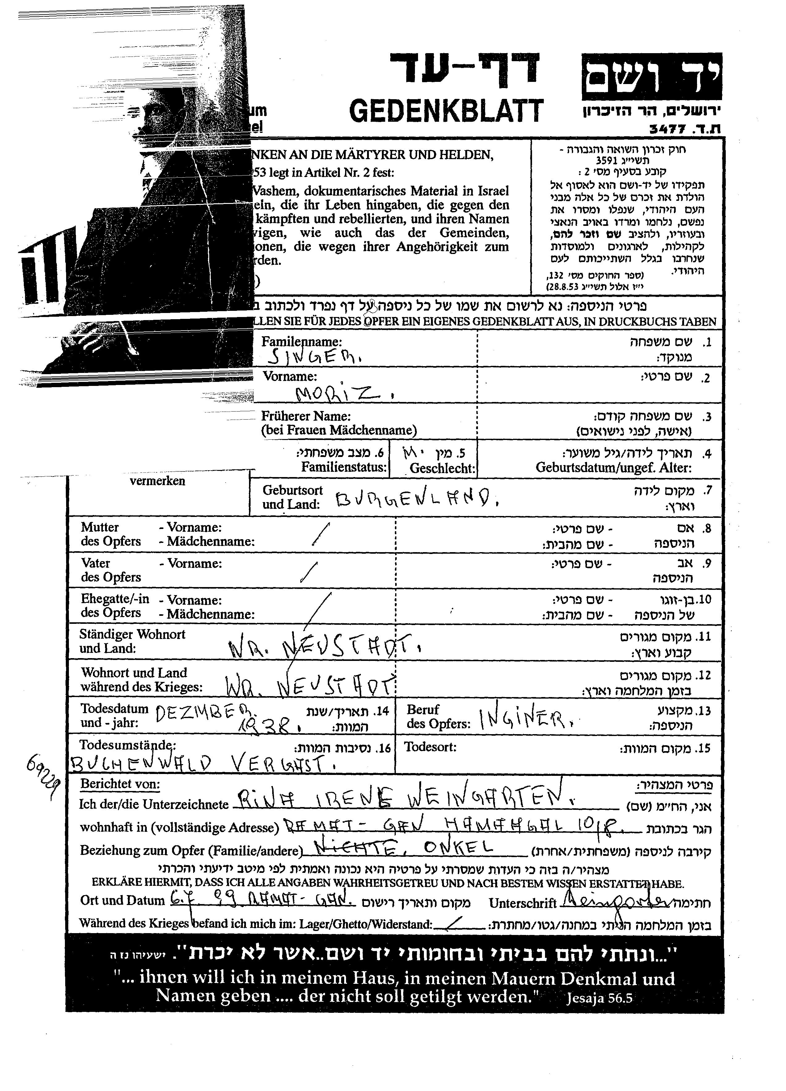 Singer Moriz Neustadt, Allemagne Feuille de témoignage