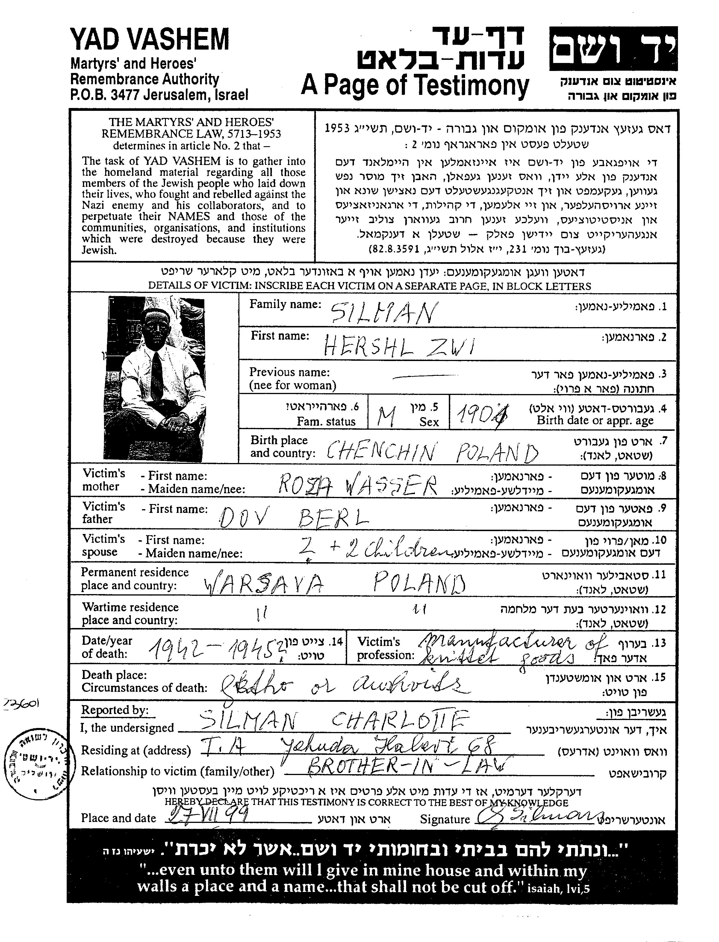 Silman Hershl Zwi 1901 Warszawa, Pologne Feuille de témoignage