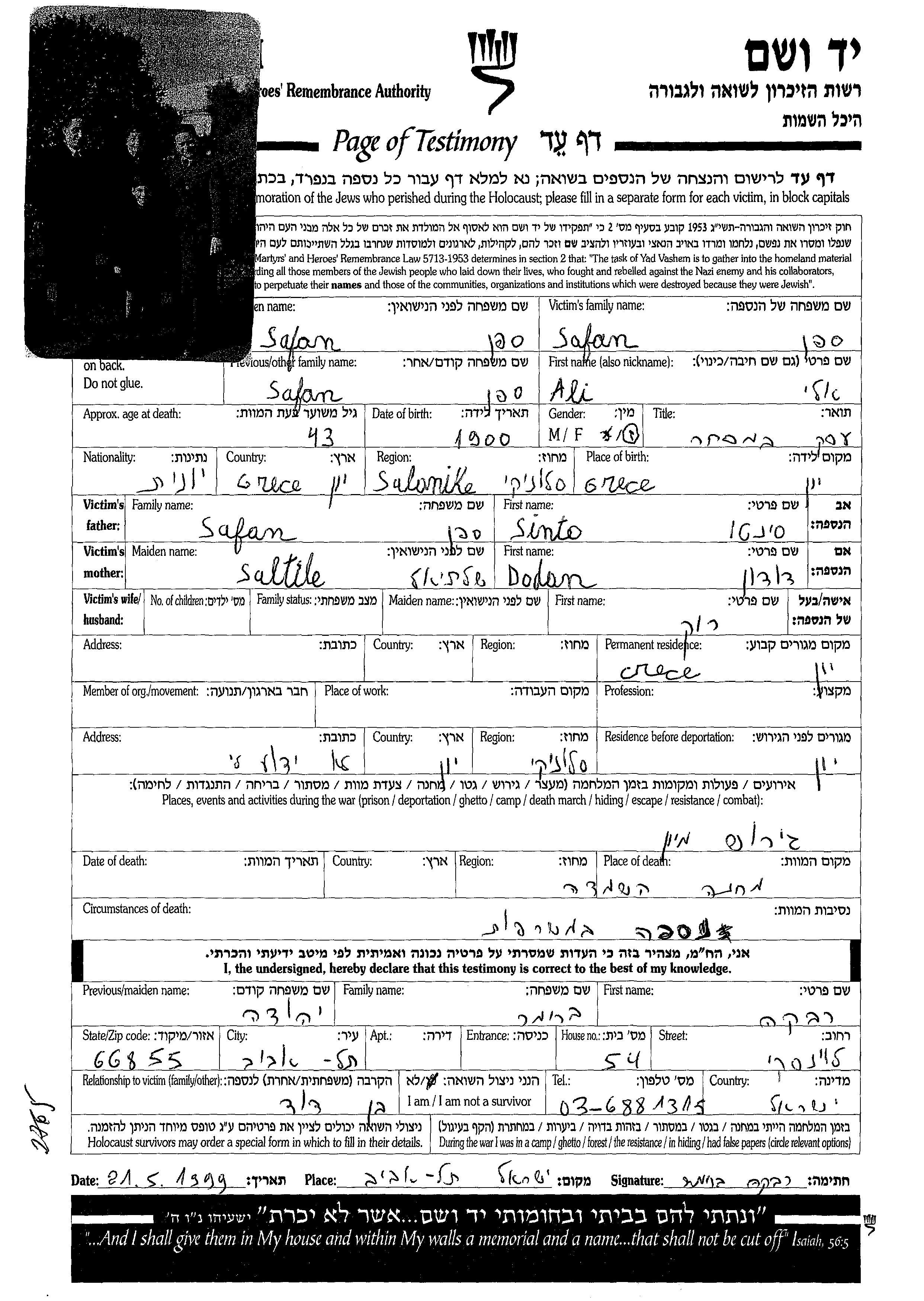 Ali Safan est né à Thessaloniki, Grèce en 1900. Avant la seconde guerre mondiale il vivait à Grèce.