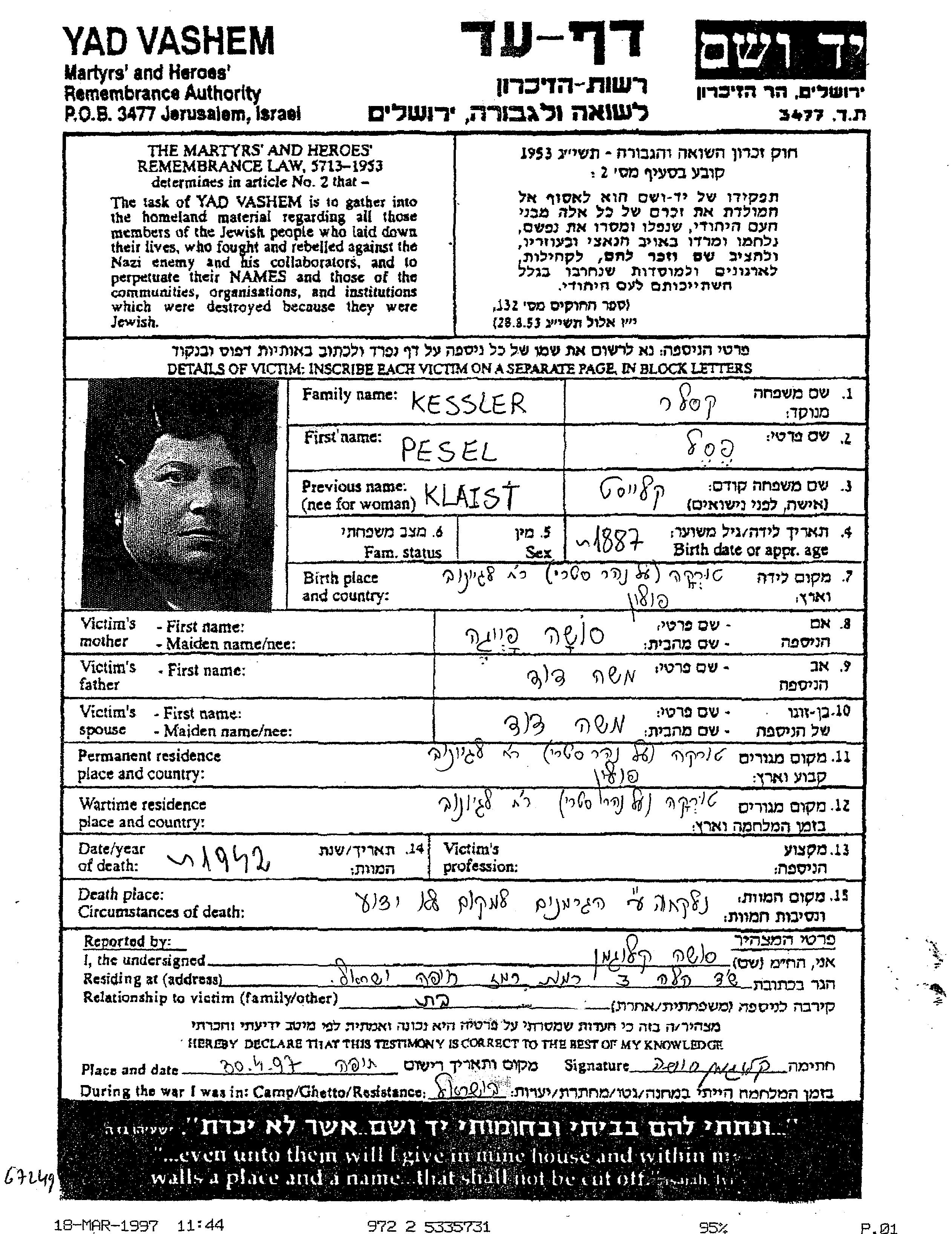 Yad Vashem - Pages of Testimony Names Memorial Collection