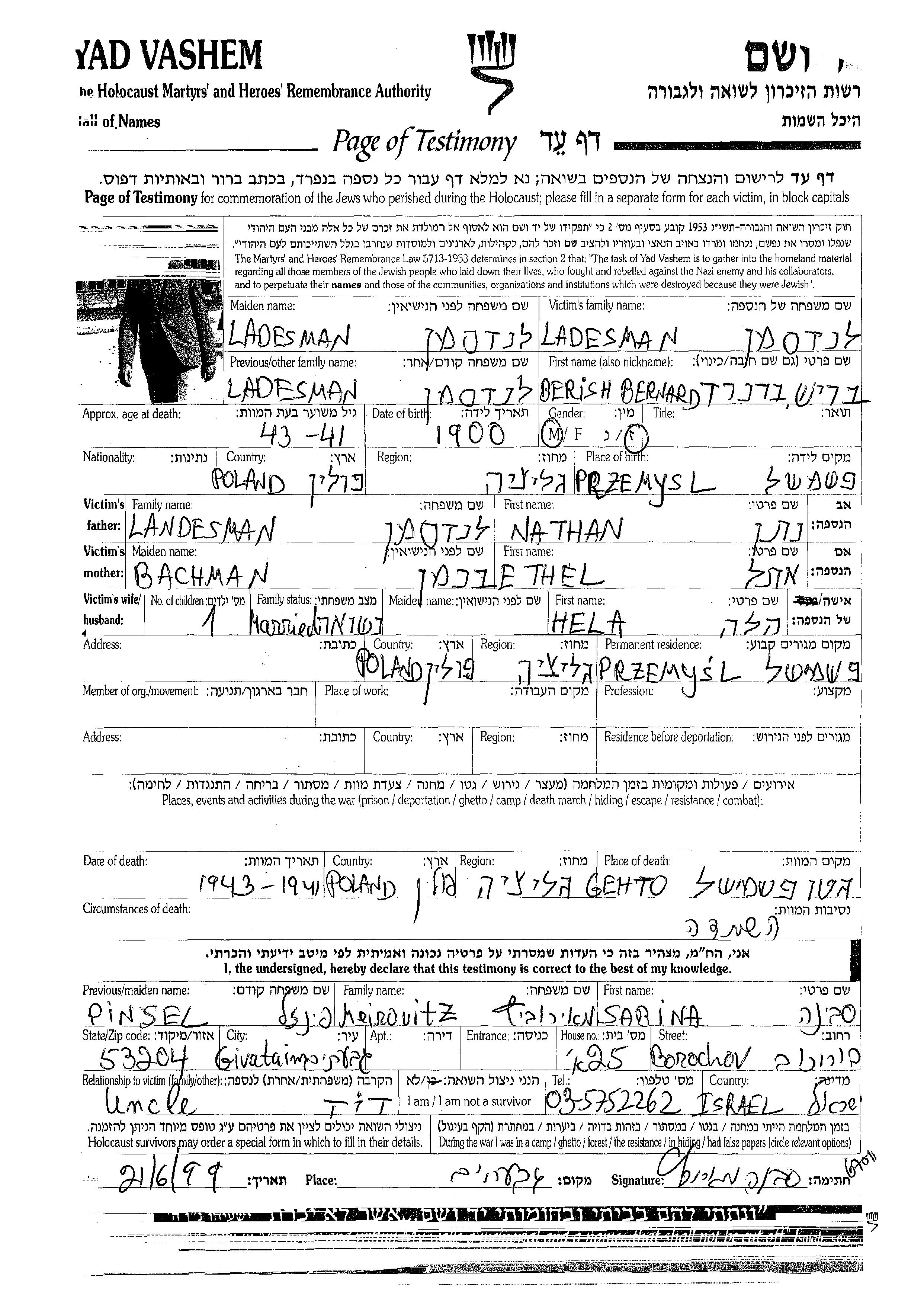 Ladesman Bernard Berish 1900 Przemysl, Pologne Feuille de témoignage