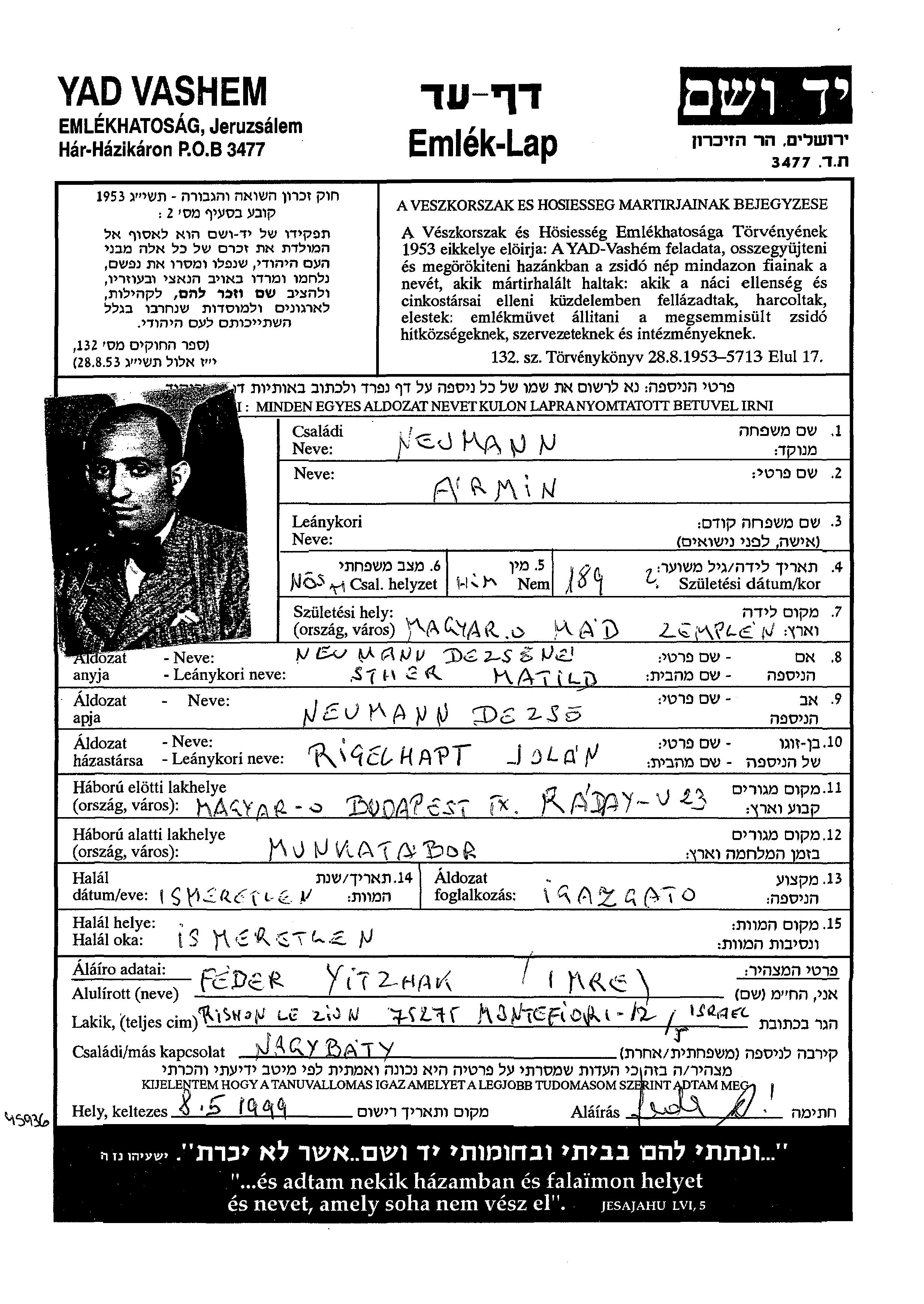 Neumann Armin Budapest, Hongrie Feuille de témoignage