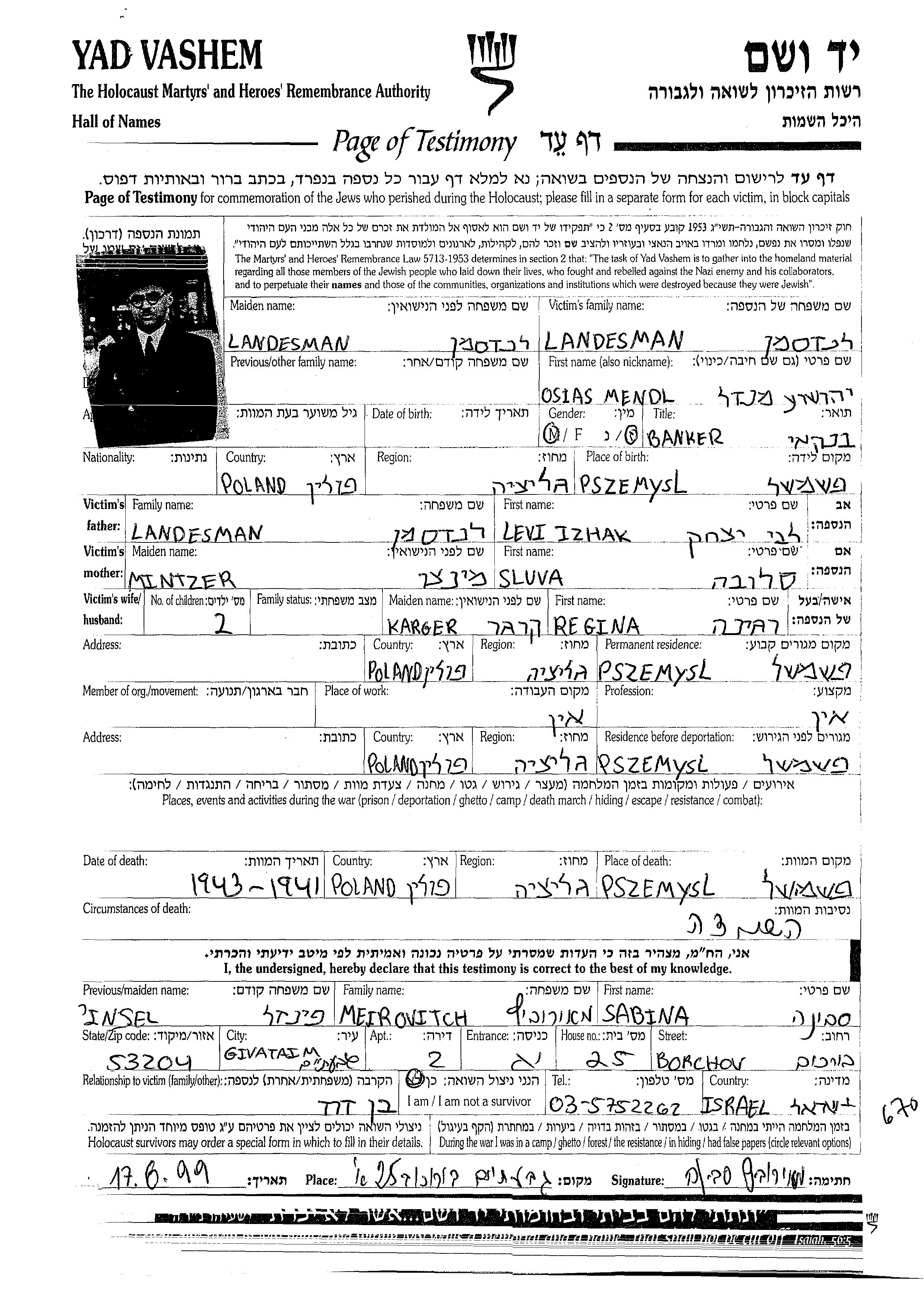 Landesman Osias Mendl Yehoshua Przemysl, Pologne Feuille de témoignage