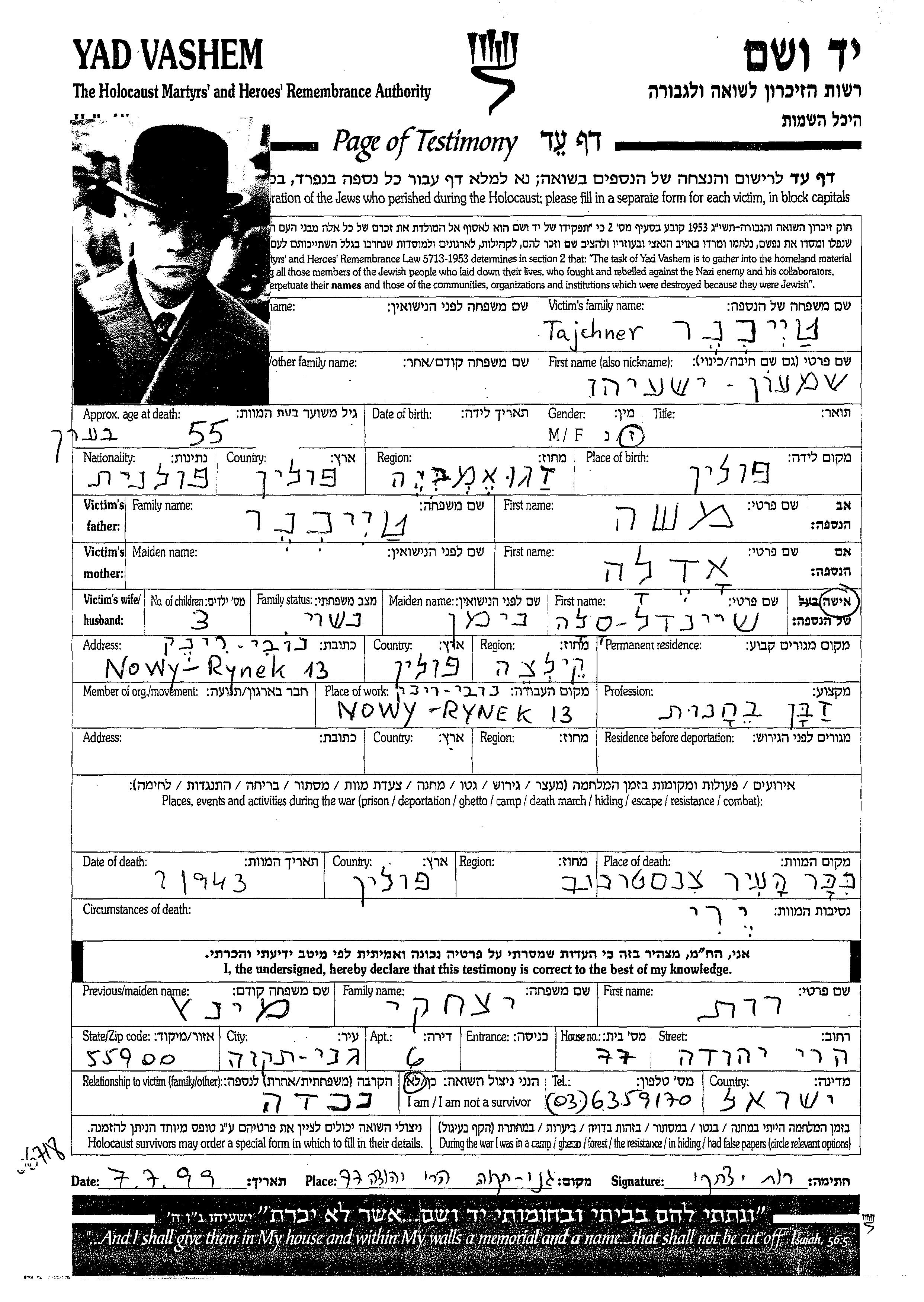 Tajchner Shimon Yeshayahu Kielce, Pologne Feuille de témoignage