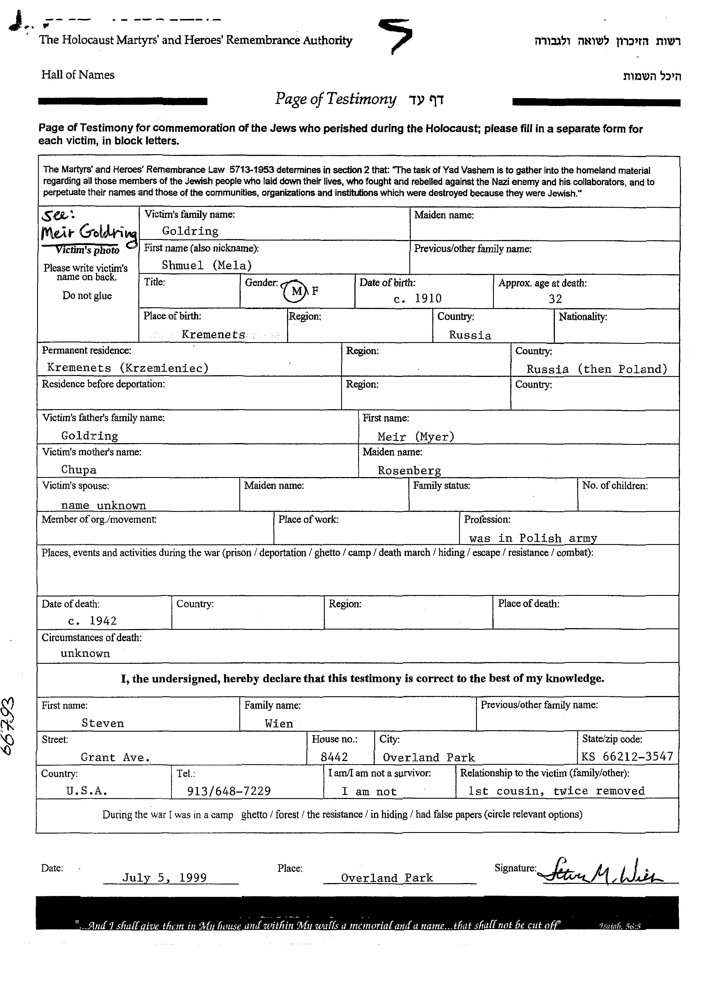 Yad Vashem - Pages of Testimony Names Memorial Collection