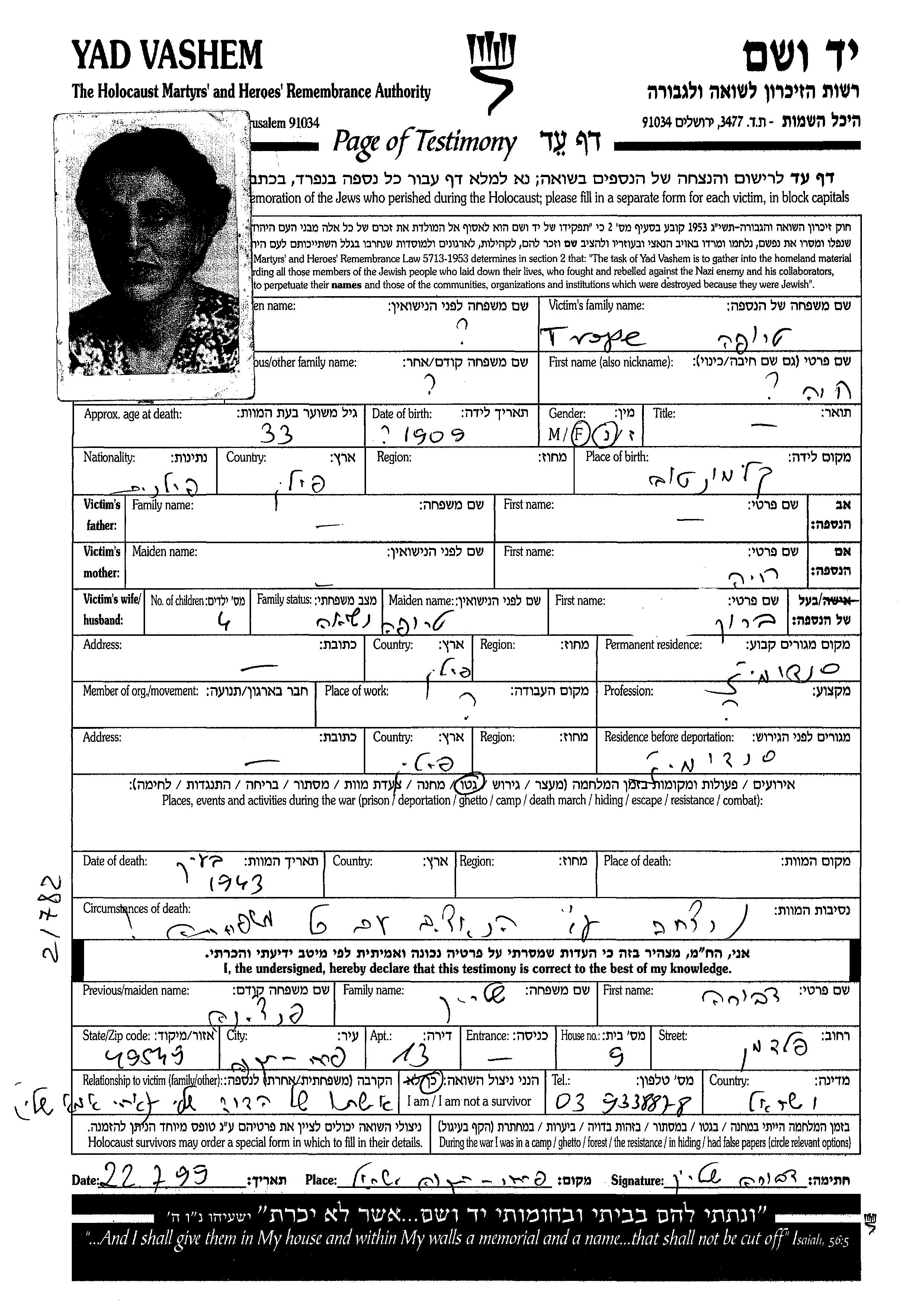 Trope Tropa | Khaia | 1909 | Sandomierz, Pologne | Feuille de témoignage |