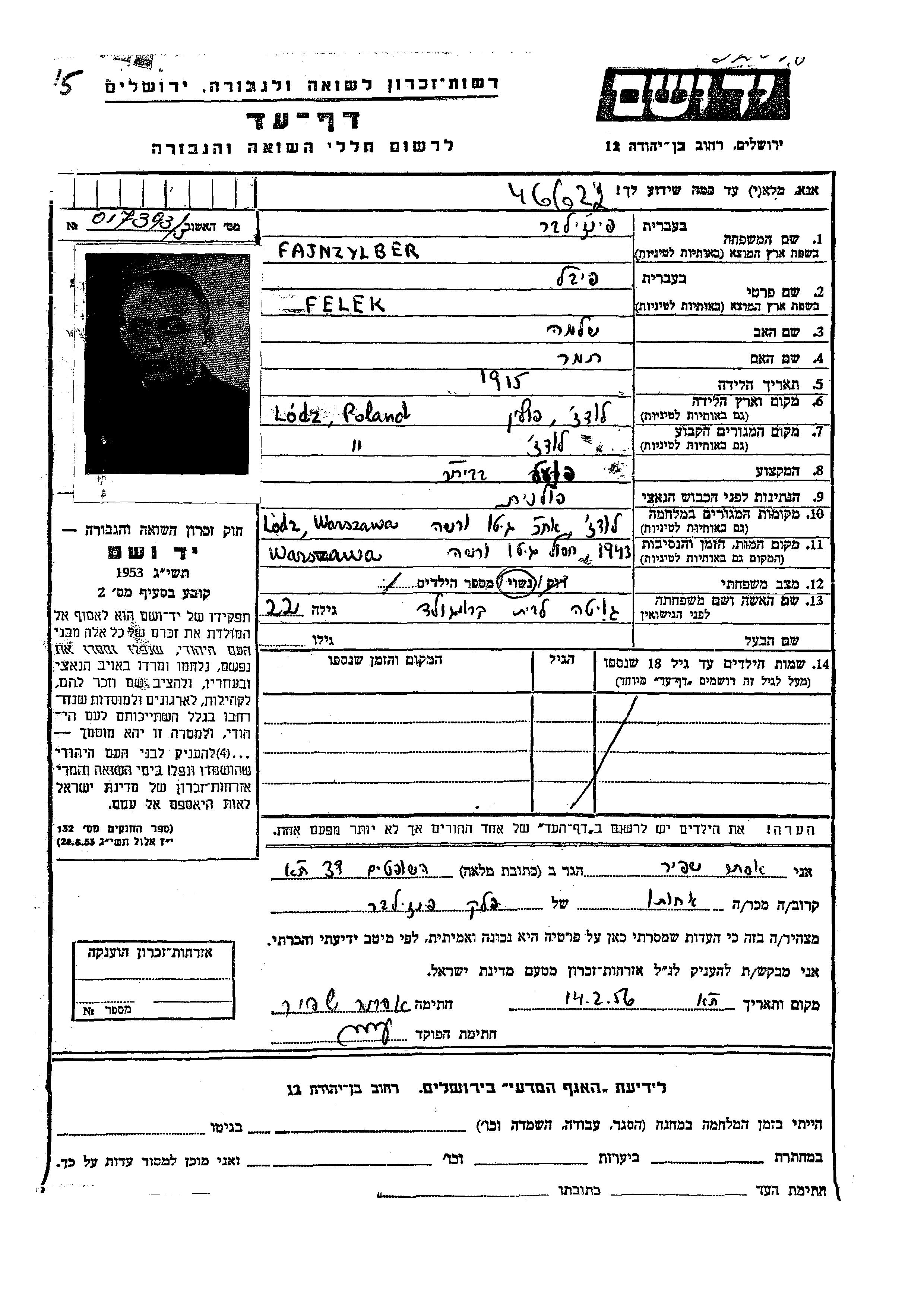 Felek Feibel Fajnzylber est né à Łódź, Pologne en 1915. Il était Ouvrier/e en usine. Avant la seconde guerre mondiale il vivait à Łódź, Pologne.