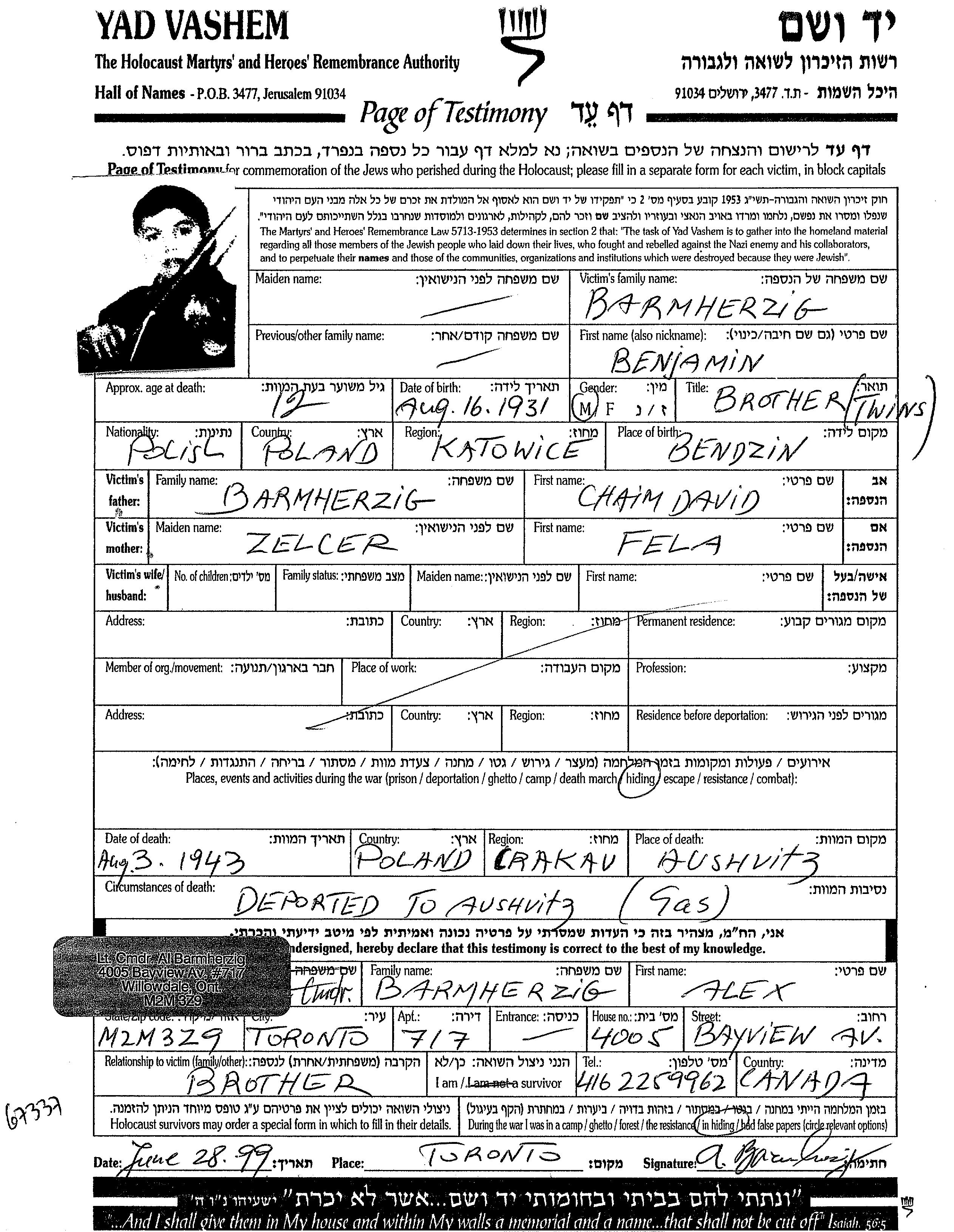 Benjamin Barmherzig est né à Będzin, Pologne en 1931. Avant la seconde guerre mondiale il vivait à Będzin, Pologne.