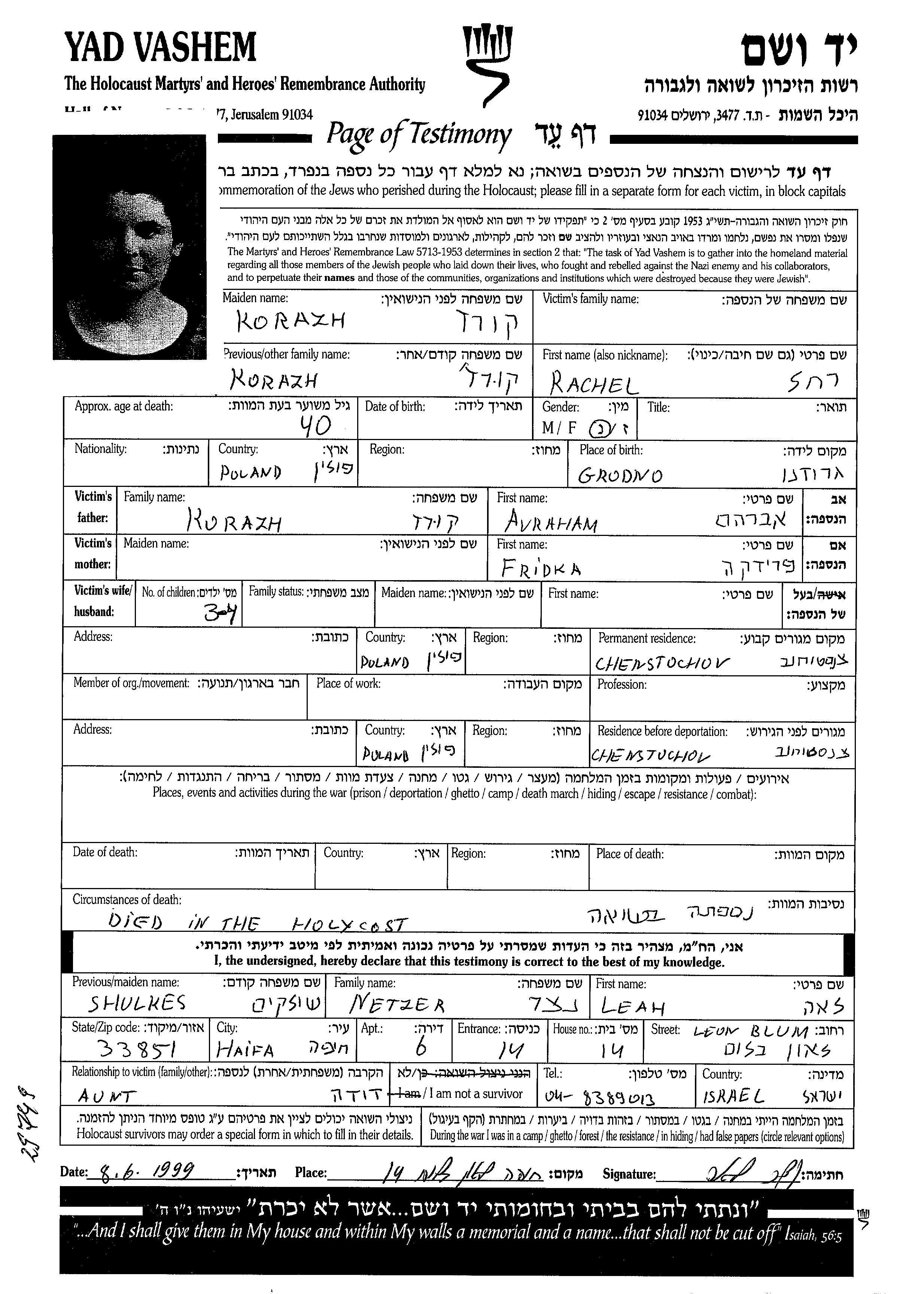 Rachel nom inconnu née Korazh est née à Grodno, Pologne. Avant la seconde guerre mondiale elle vivait à Czestochowa, Pologne.