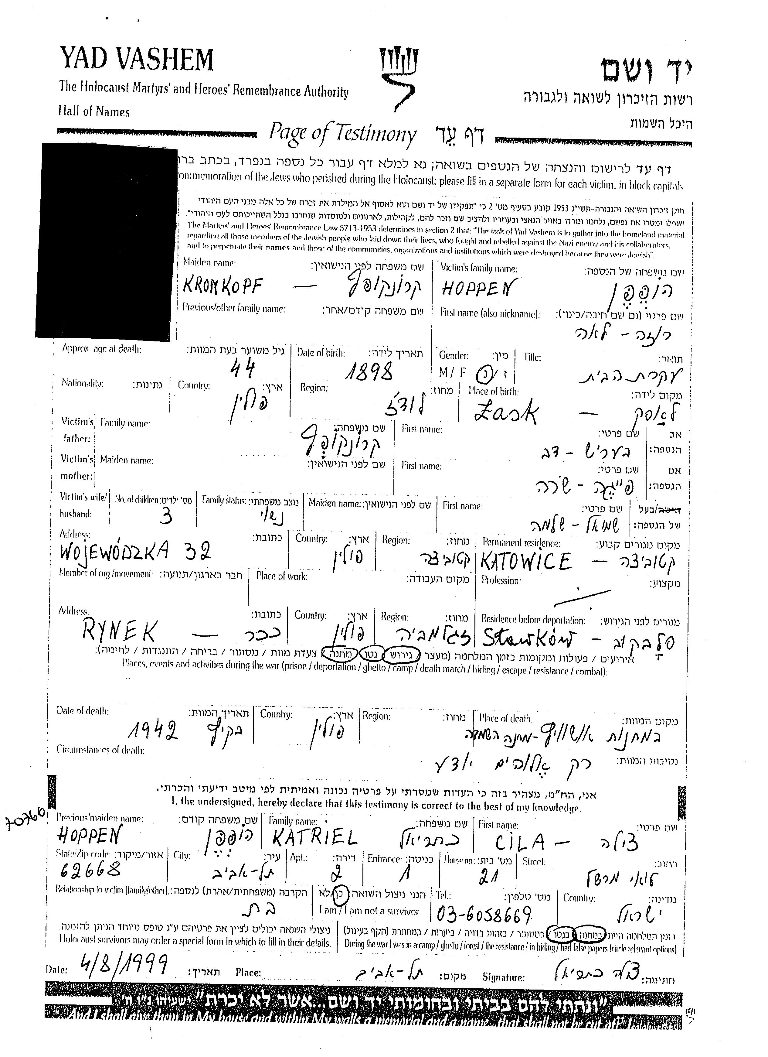 Hoppen | Roza Lea | 1898 | Katowice, Pologne | Feuille de témoignage |