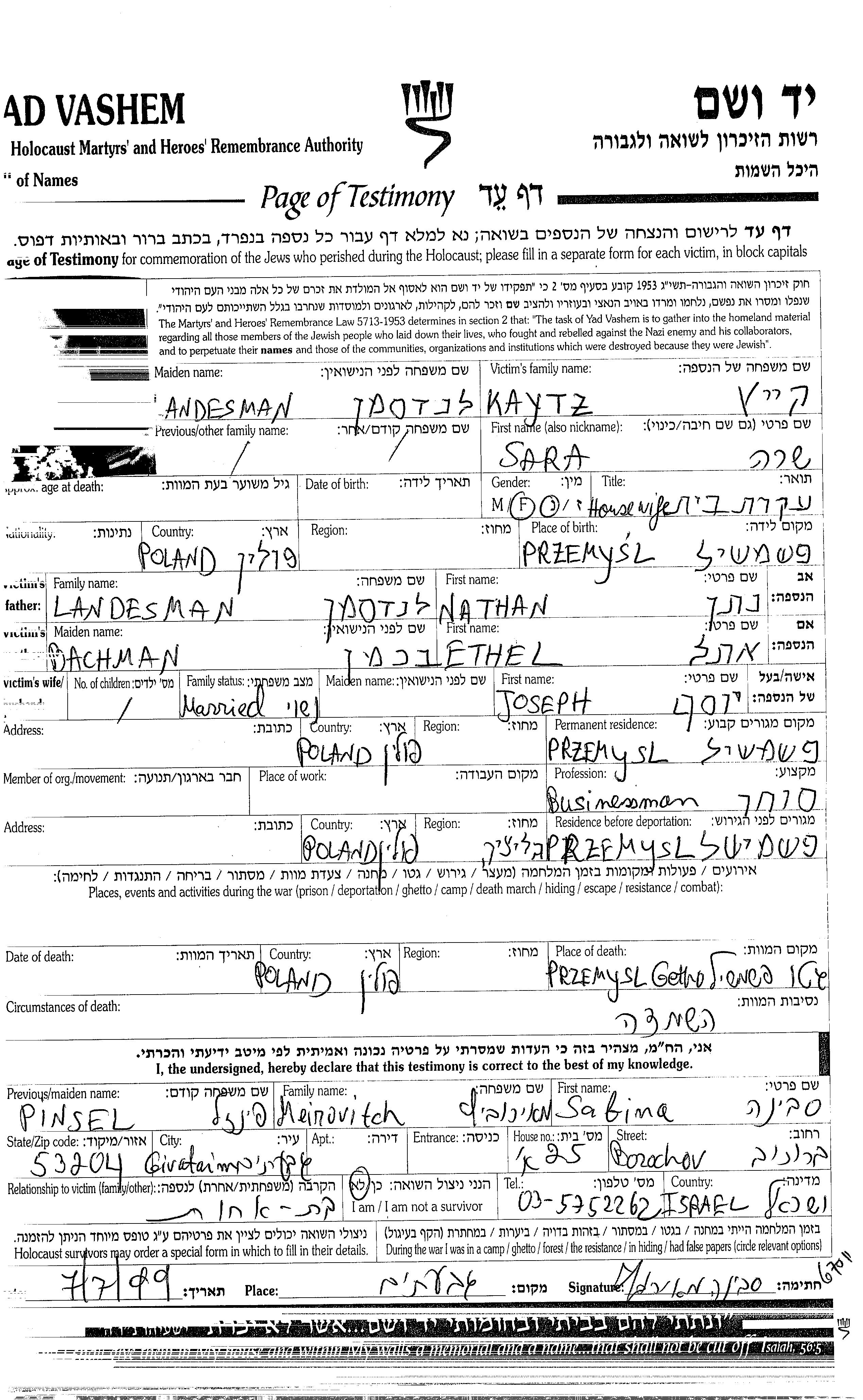 Yad Vashem - Pages of Testimony Names Memorial Collection