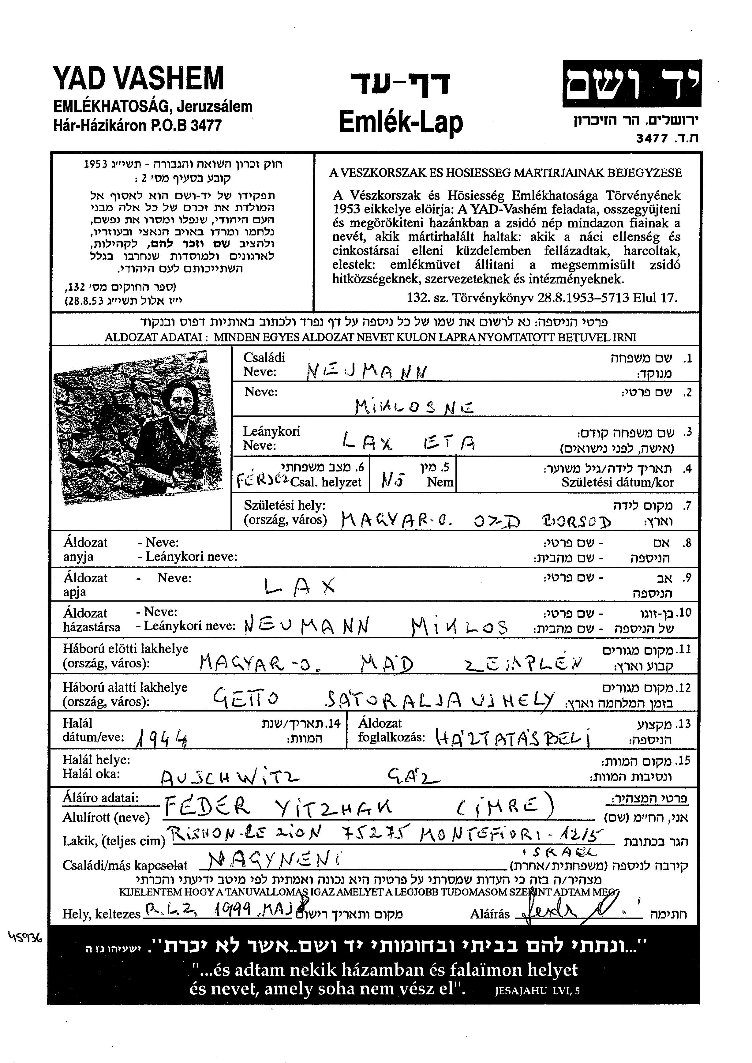 Neumann Eta Mad, Hongrie Feuille de témoignage