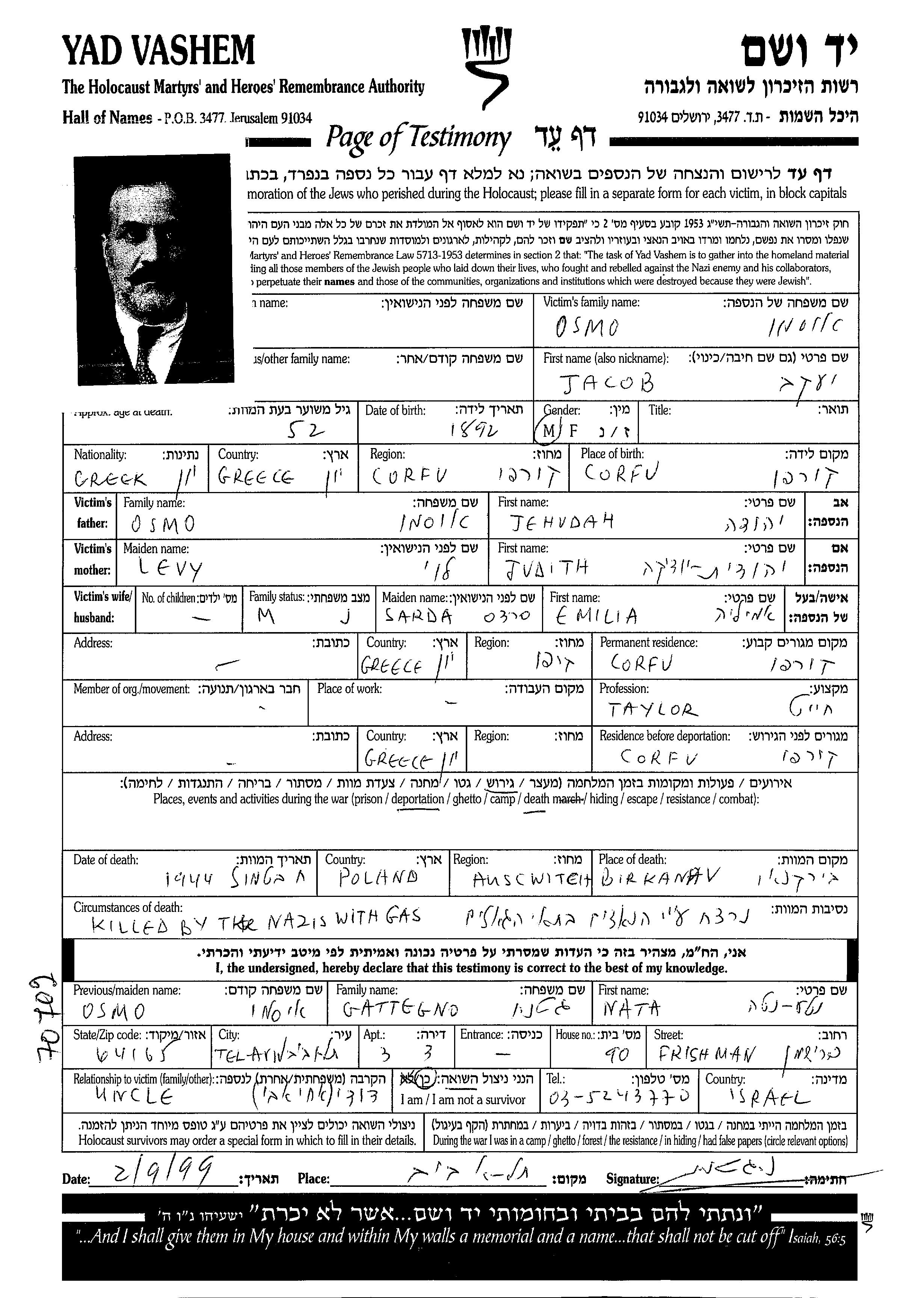 Jacob Osmo est né à Kerkyra, Grèce en 1892. Il était Tailleur. Avant la seconde guerre mondiale il vivait à Kerkyra, Grèce.