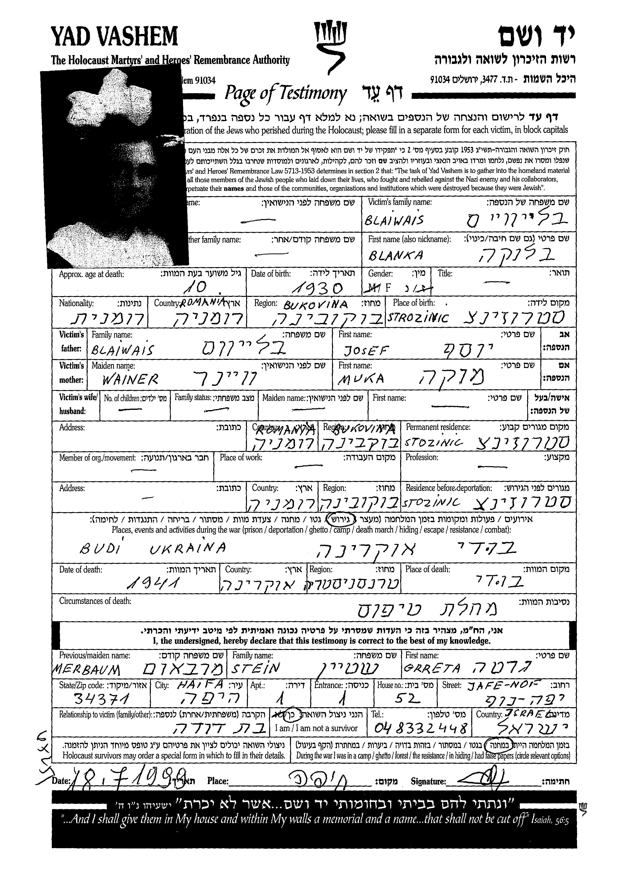 Yad Vashem - Pages of Testimony Names Memorial Collection