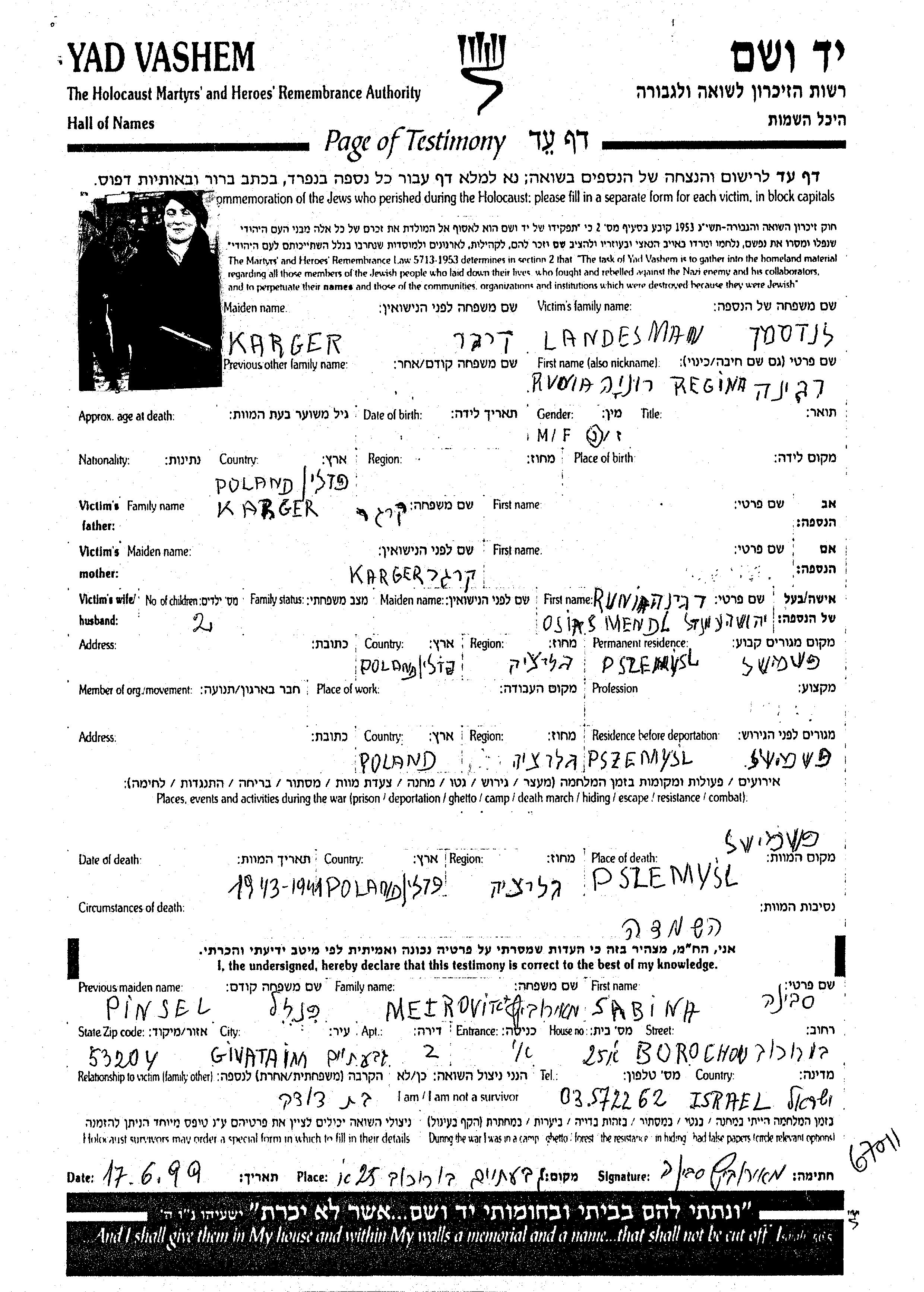 Yad Vashem - Pages of Testimony Names Memorial Collection