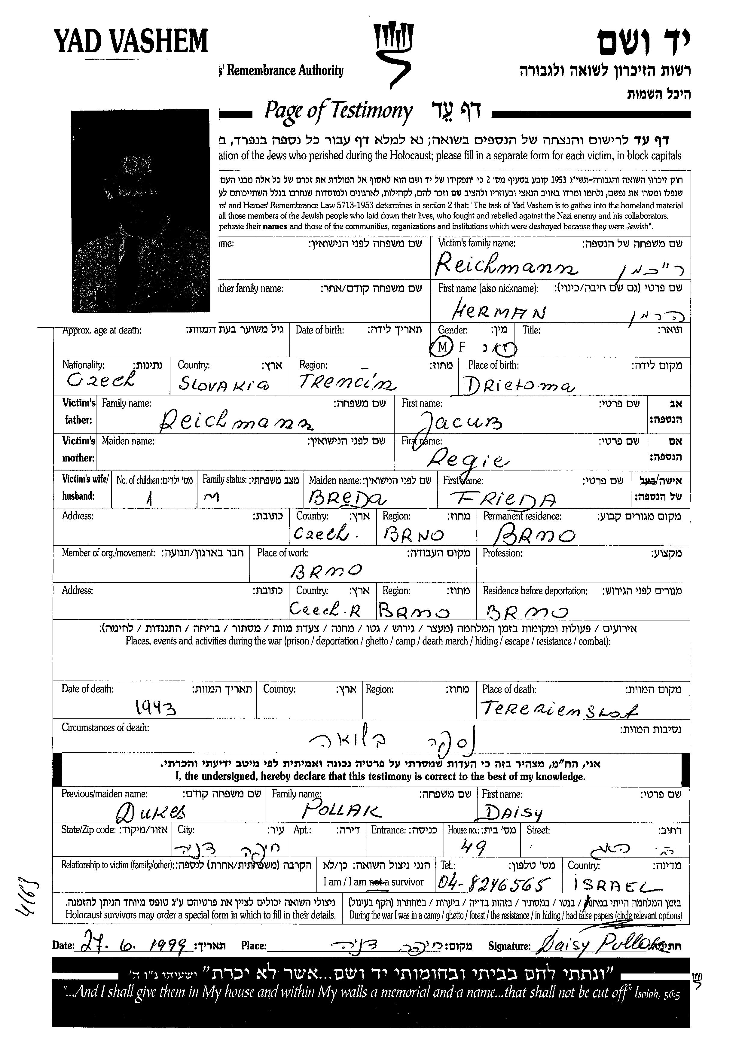| Reichmann | Herman | Brno, Tchécoslovaquie | Feuille de témoignage | |