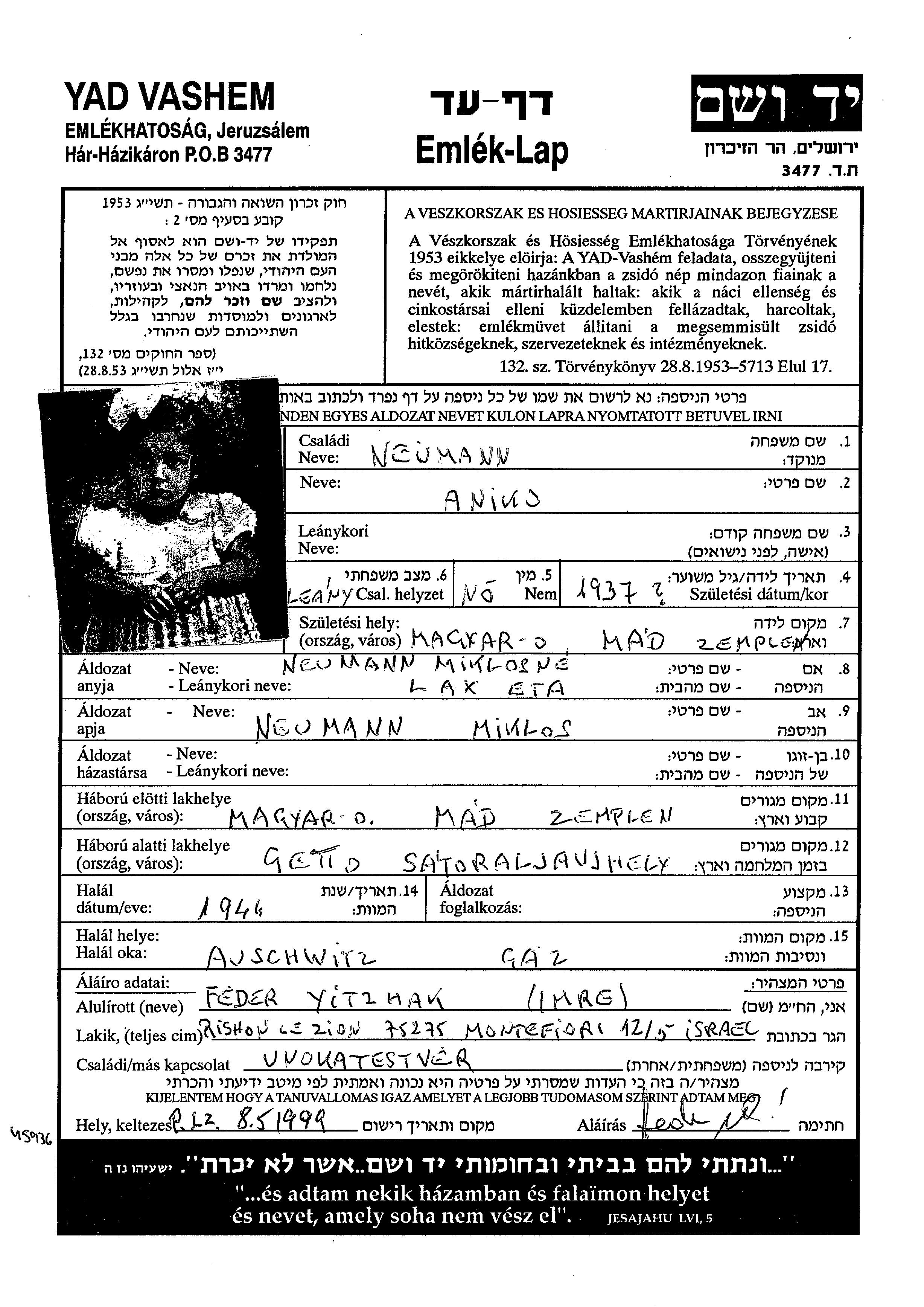 Yad Vashem - Pages of Testimony Names Memorial Collection