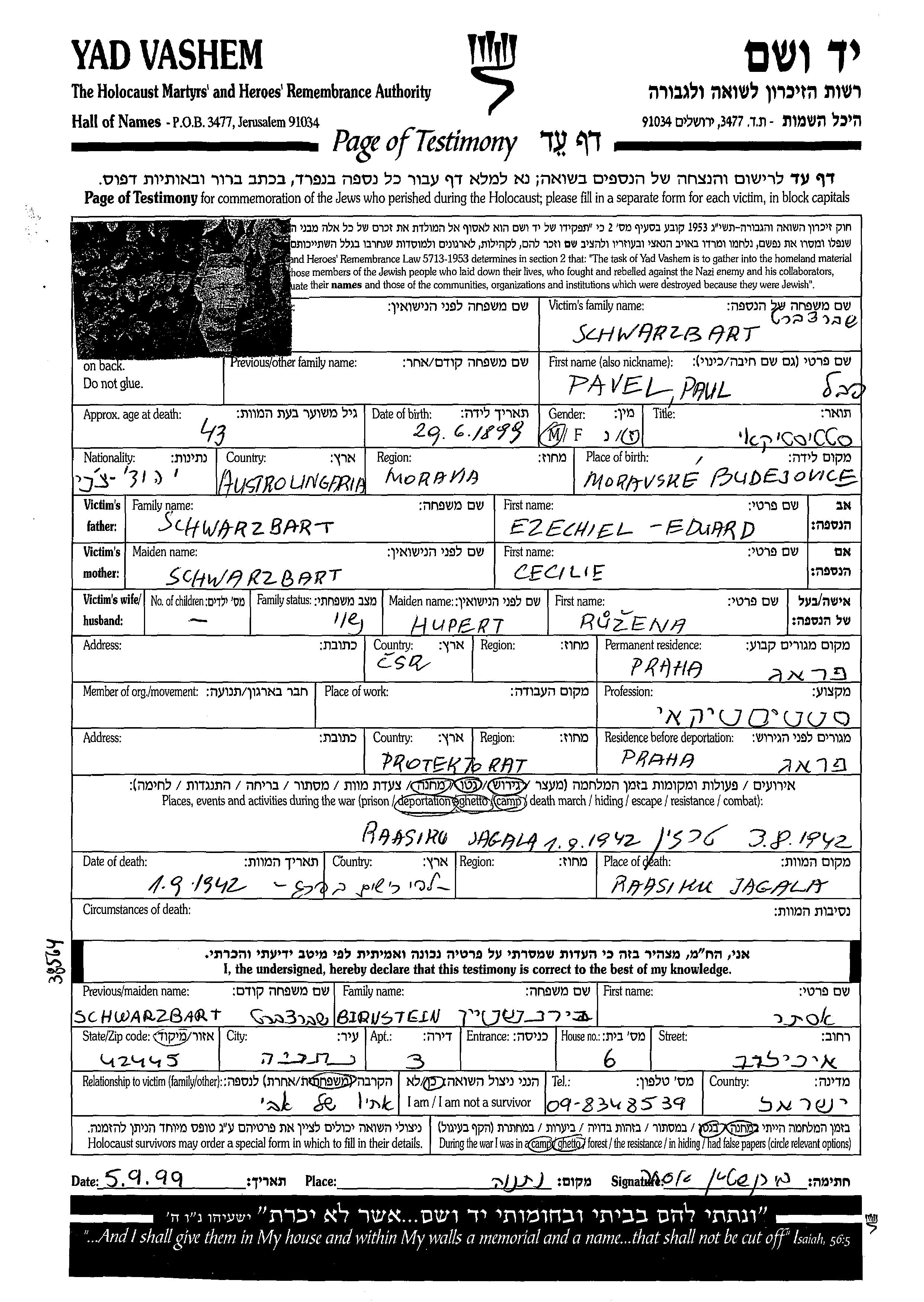Schwarzbart Pavel 1899 Praha, Tchécoslovaquie Feuille de témoignage