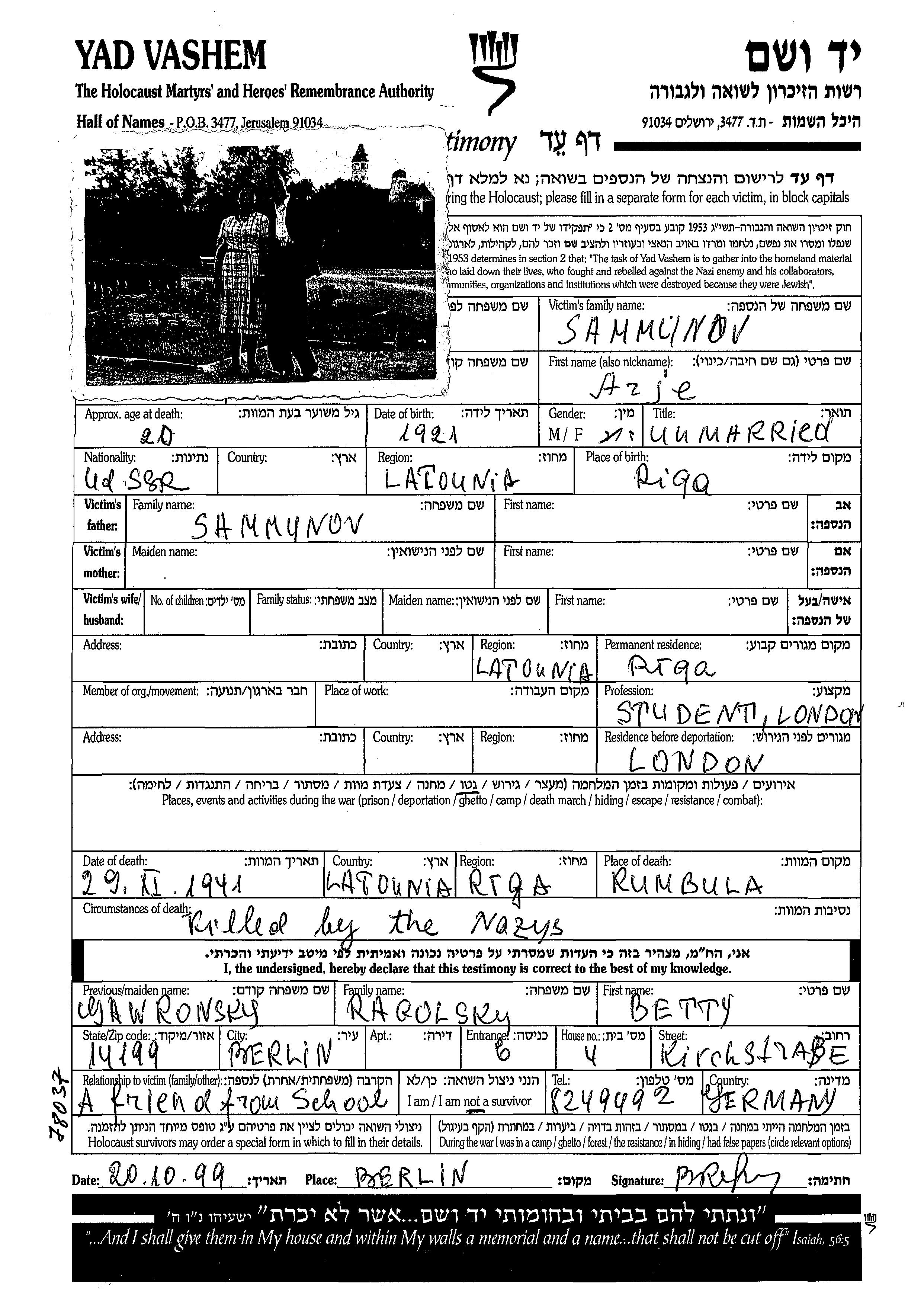 Sammunov | Arje | 1921 | London, Grande-Bretagne | Feuille de témoignage |