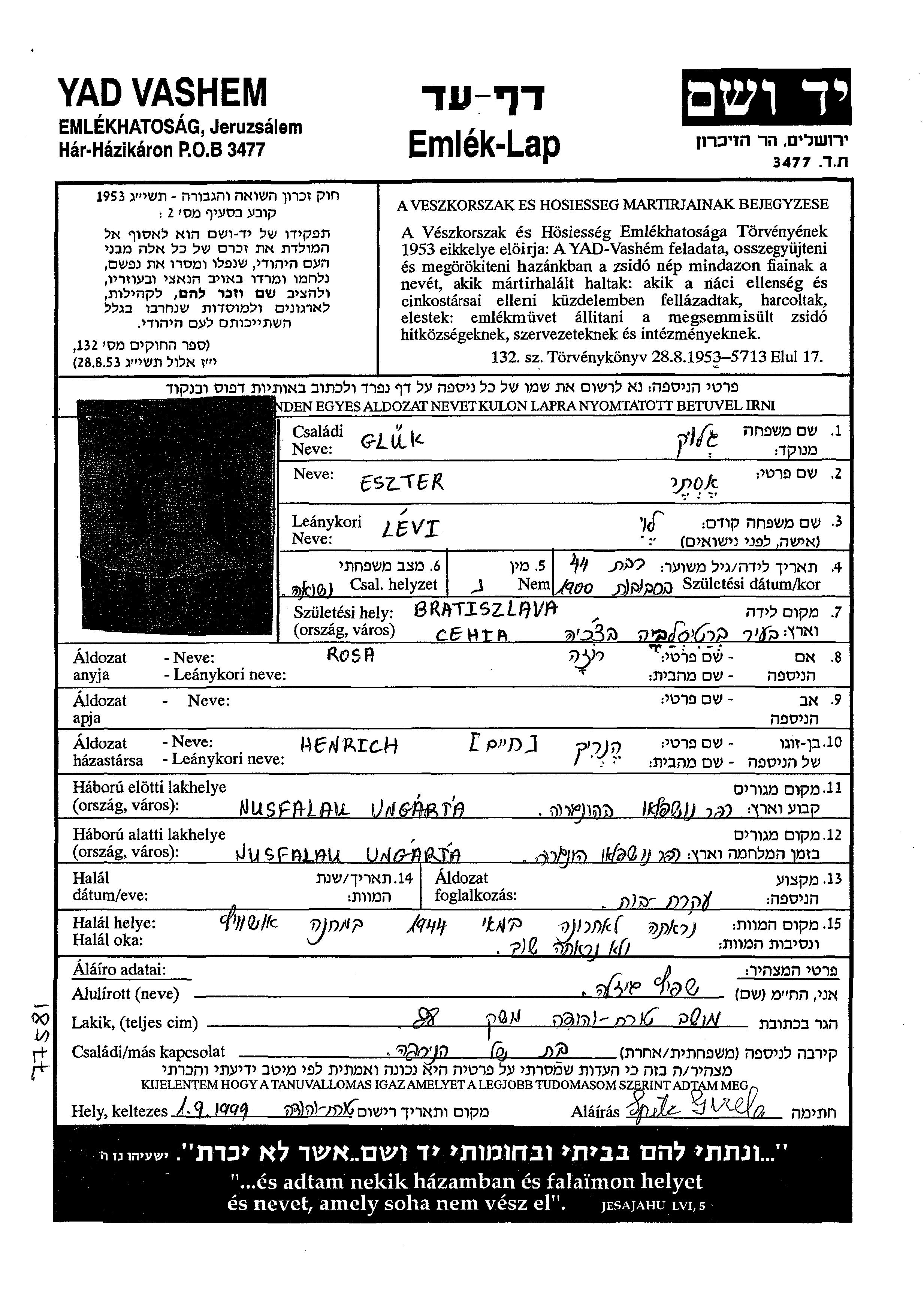 Eszter Gluk née Levi est née à Bratislava, Tchécoslovaquie en 1900. Elle était Femme au foyer. Avant la seconde guerre mondiale elle vivait à Nusfalau, Roumanie.