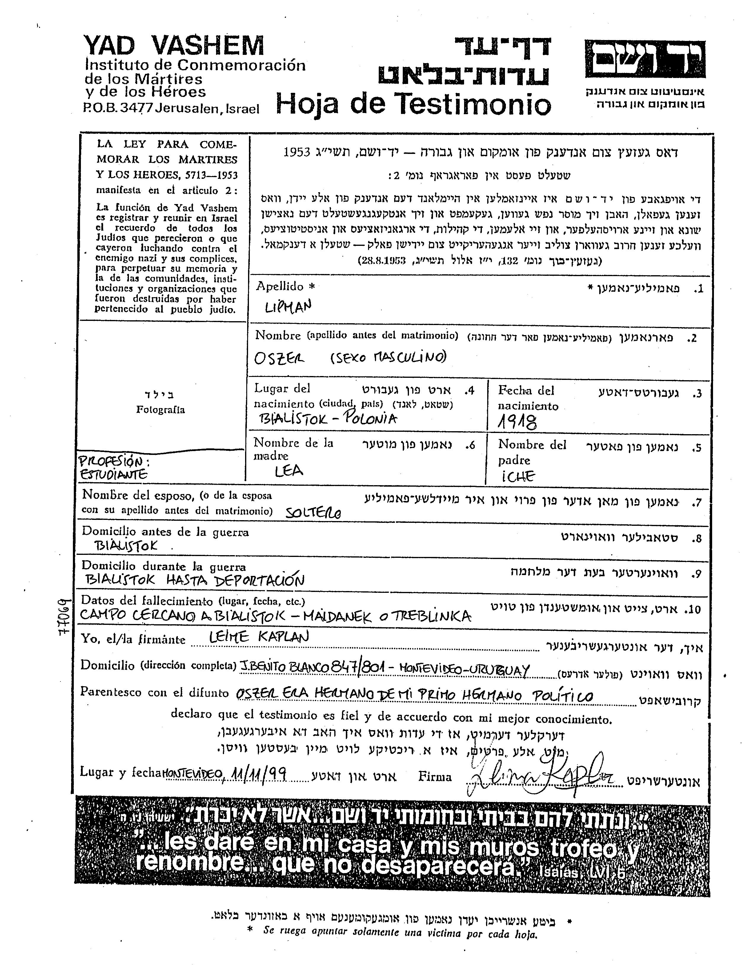 Lipman | Oszer | 1918 | Bialystok, Pologne | Feuille de témoignage |
