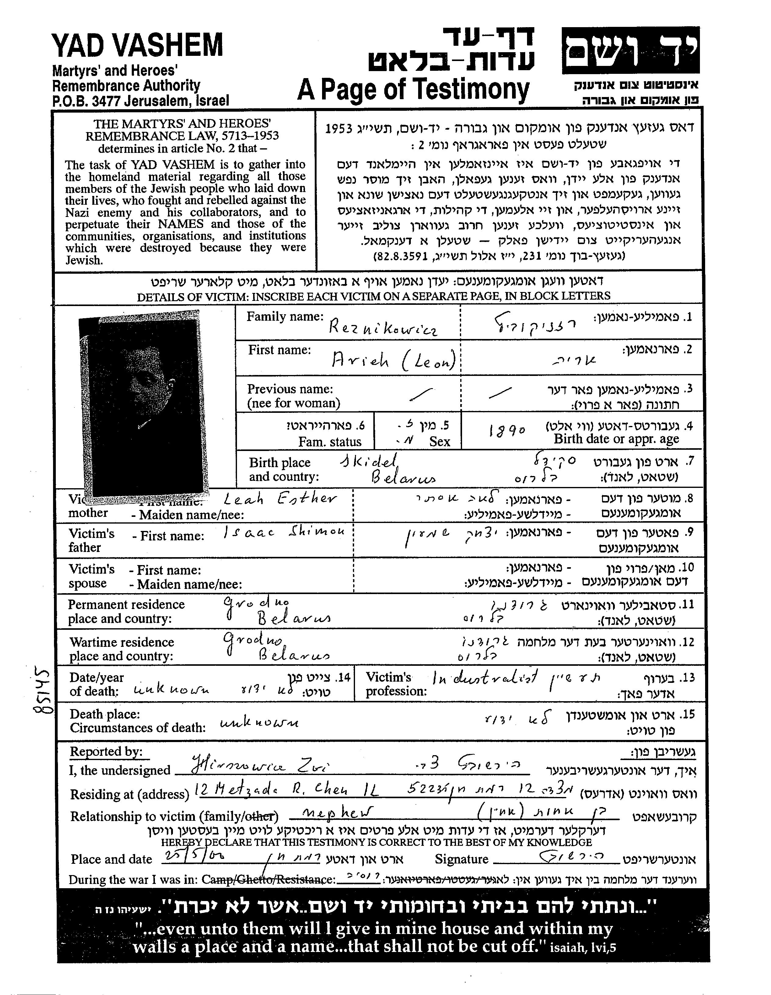 Reznikowicz Arieh Leon 1890 Grodno, Pologne Feuille de témoignage