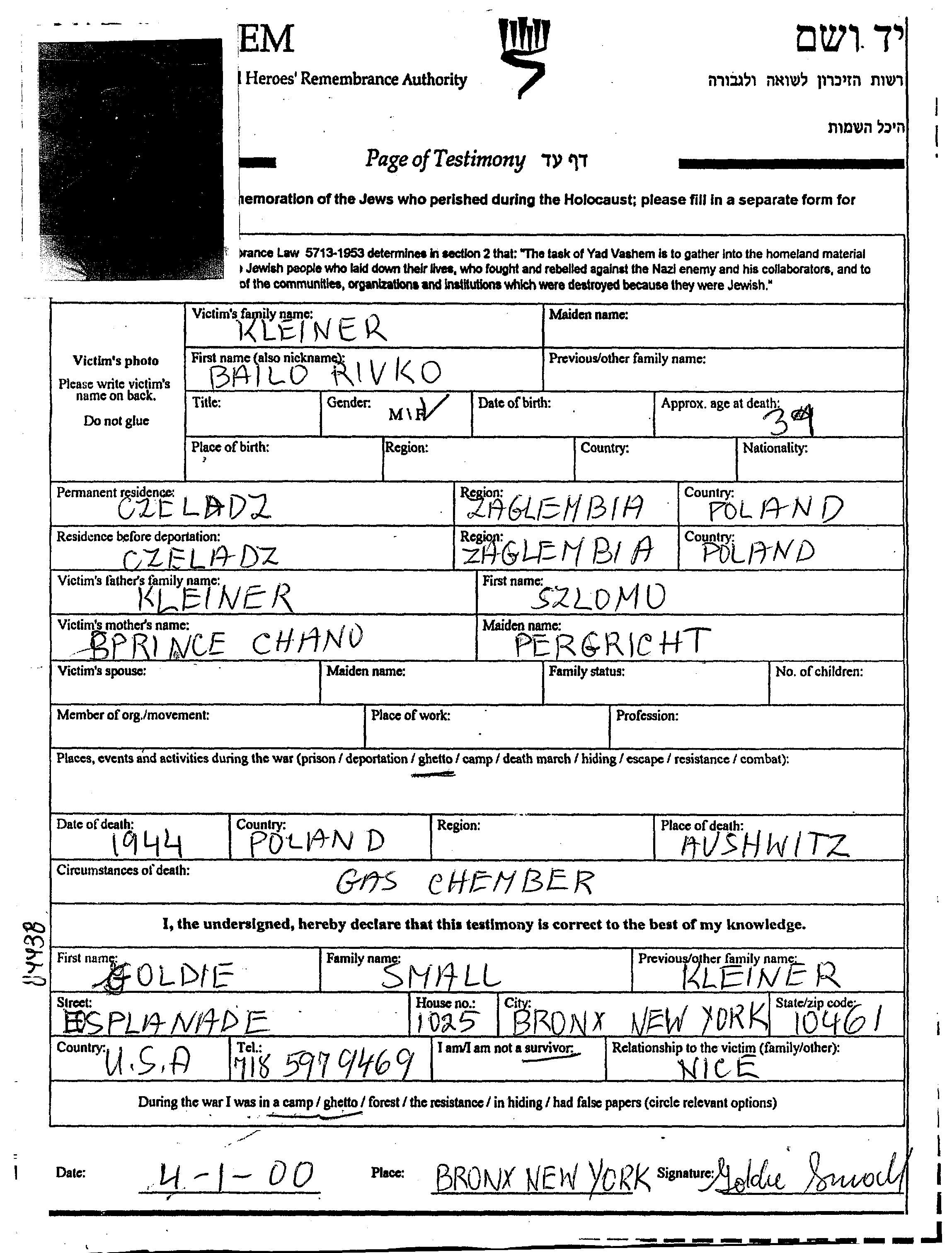 Kleiner Bailo Rivko Czeladz, Pologne Feuille de témoignage