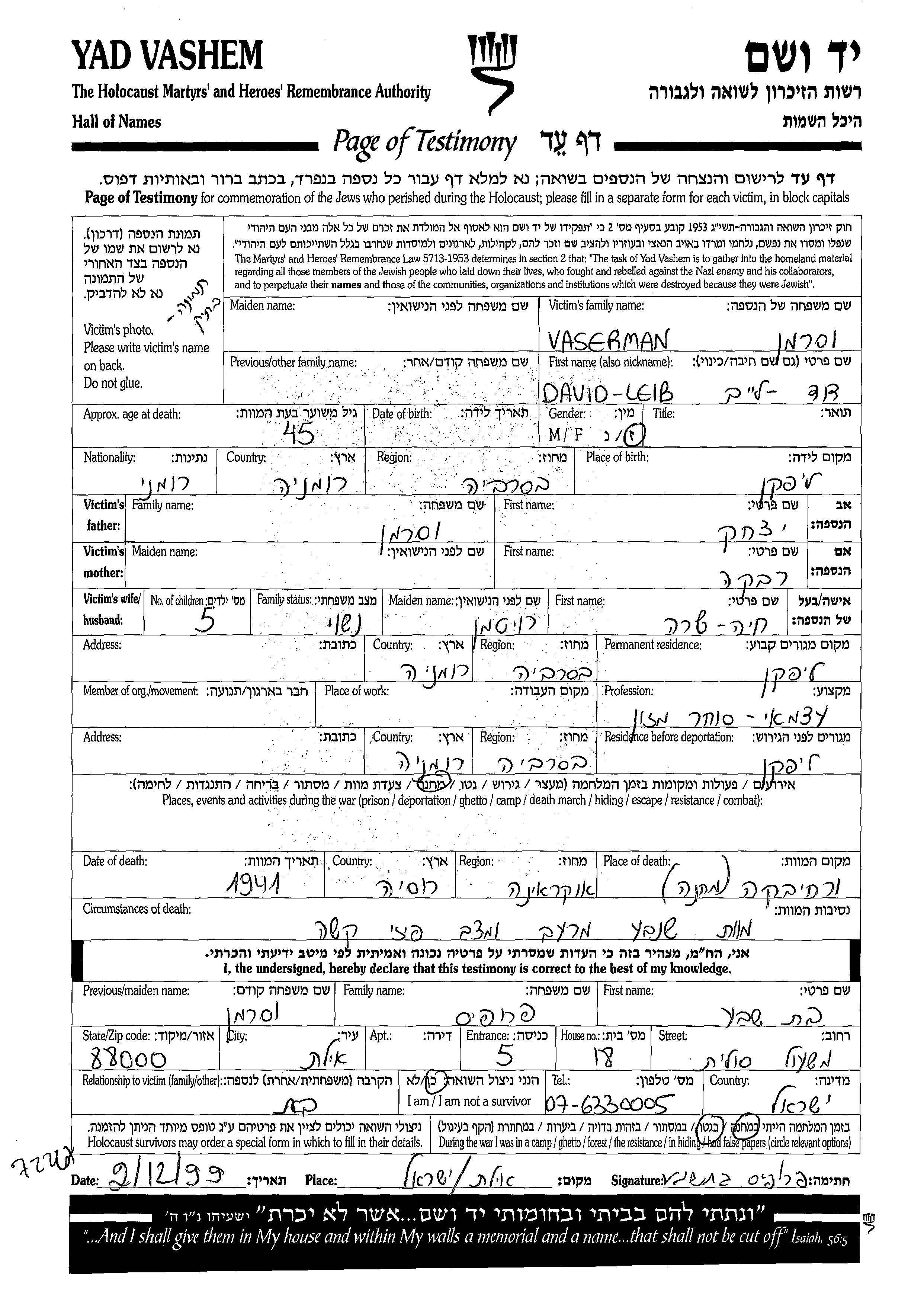 Vaserman David Leib Lipkan, Roumanie Feuille de témoignage