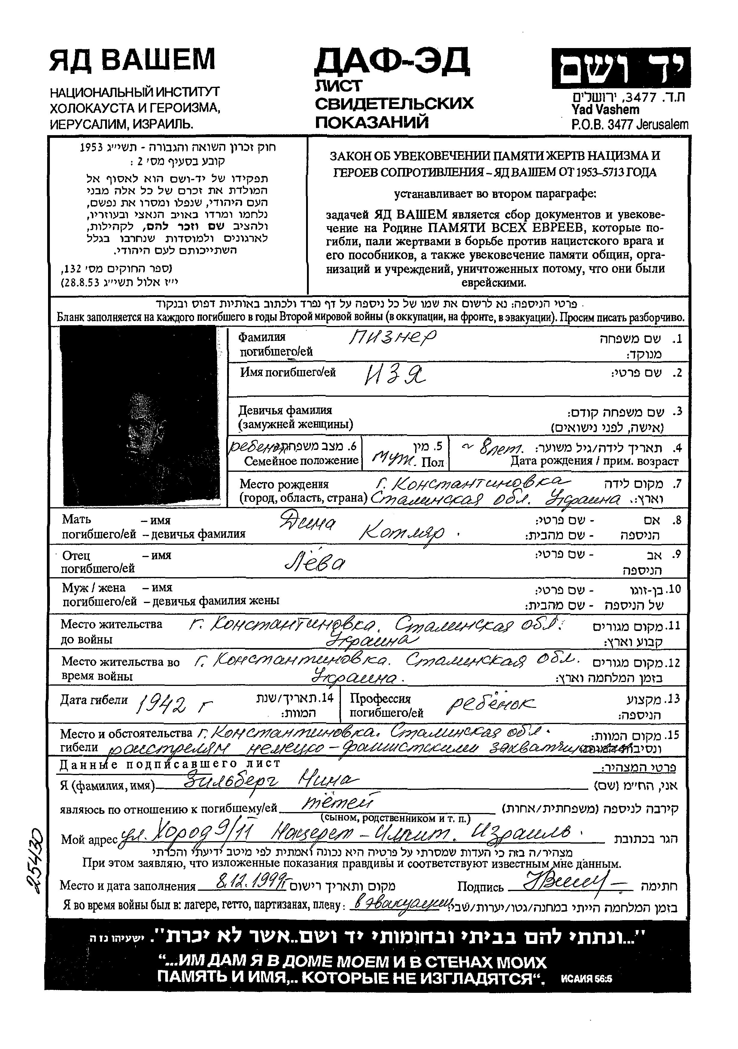 Izya a été assassiné pendant la Shoah. Lieu de la mort: Konstantinovka, Ukraine (URSS) en 1942.
