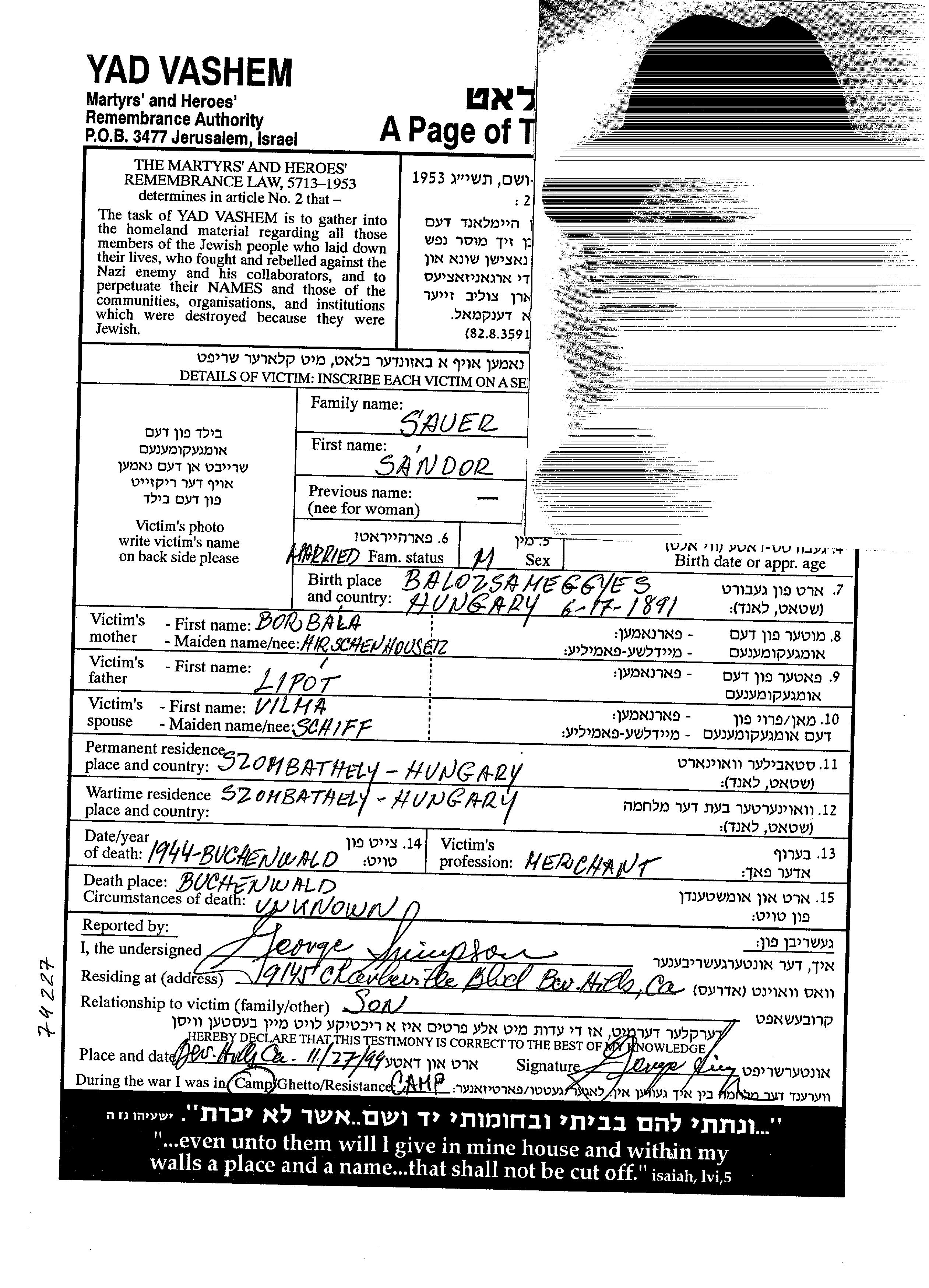 Sandor a été assassiné pendant la Shoah. Lieu de la mort: Buchenwald, Allemagne en 1944.