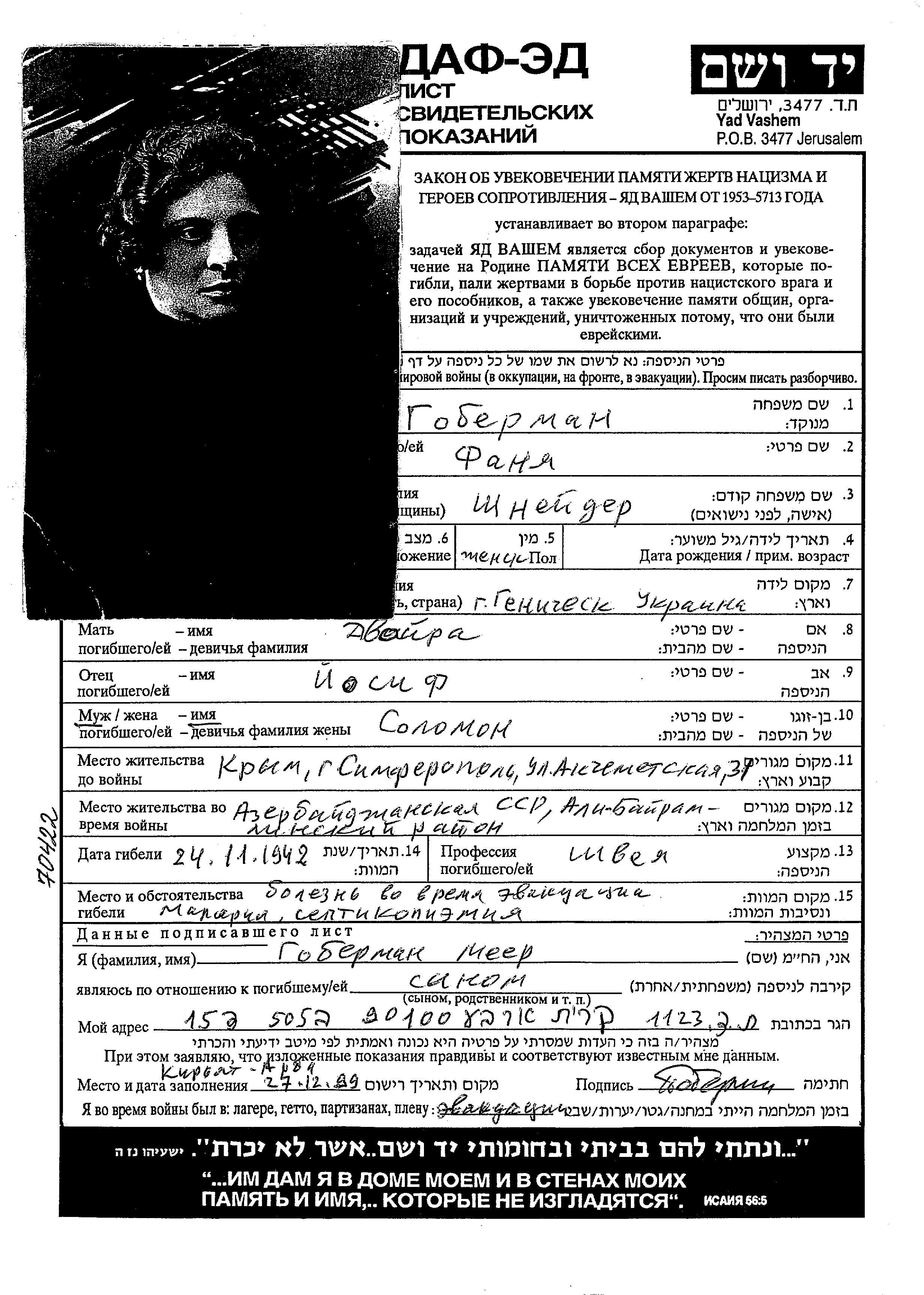 Goberman | Fanya | Simferopol, Russie (URSS) | Feuille de témoignage | |