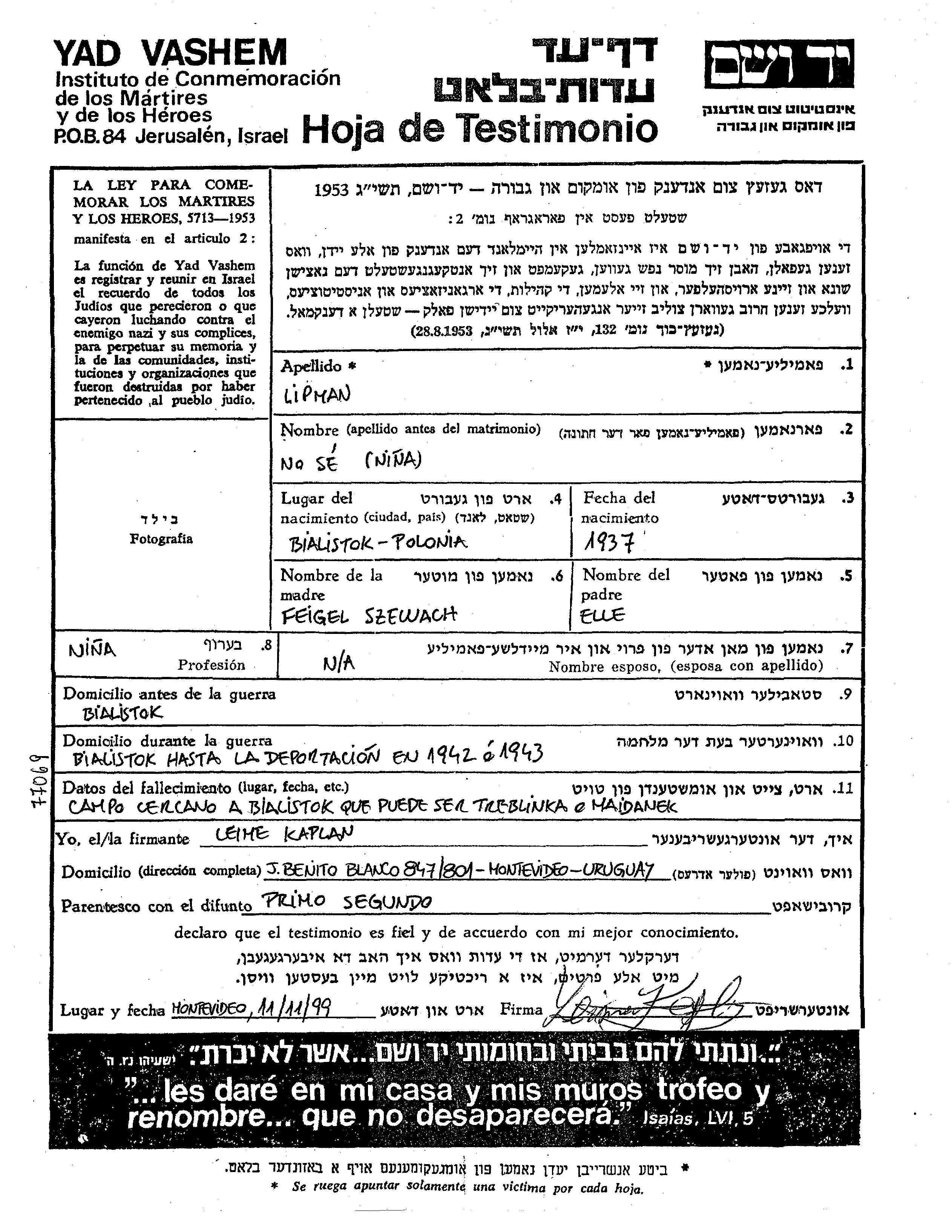 Lipman prénom inconnu 1937 Bialystok, Pologne Feuille de témoignage