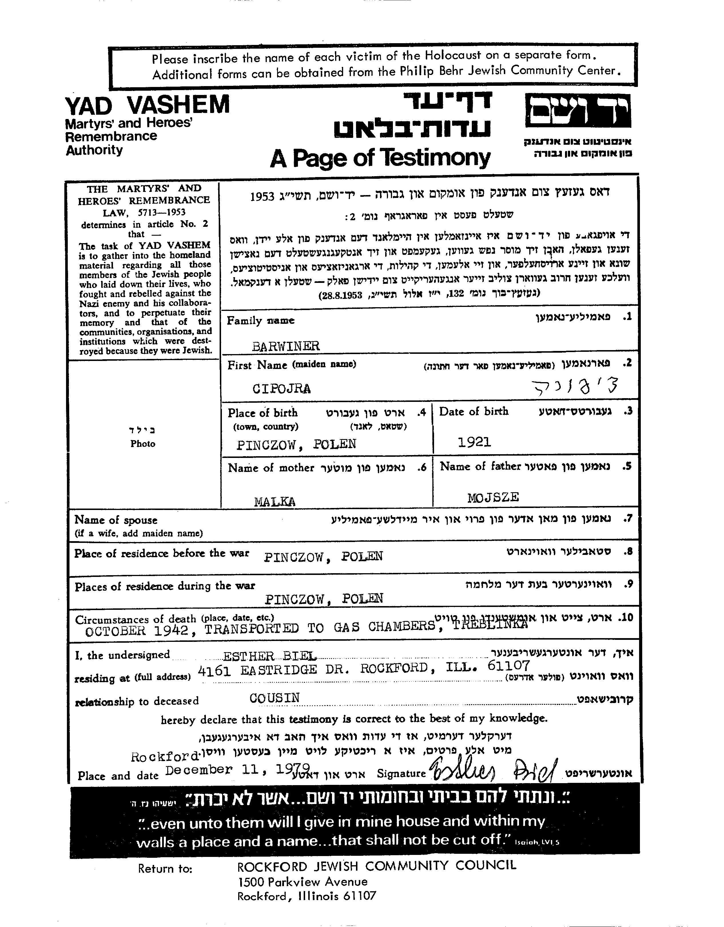 Barwiner | Cipojra | 1921 | Pinczow, Pologne | Feuille de témoignage |
