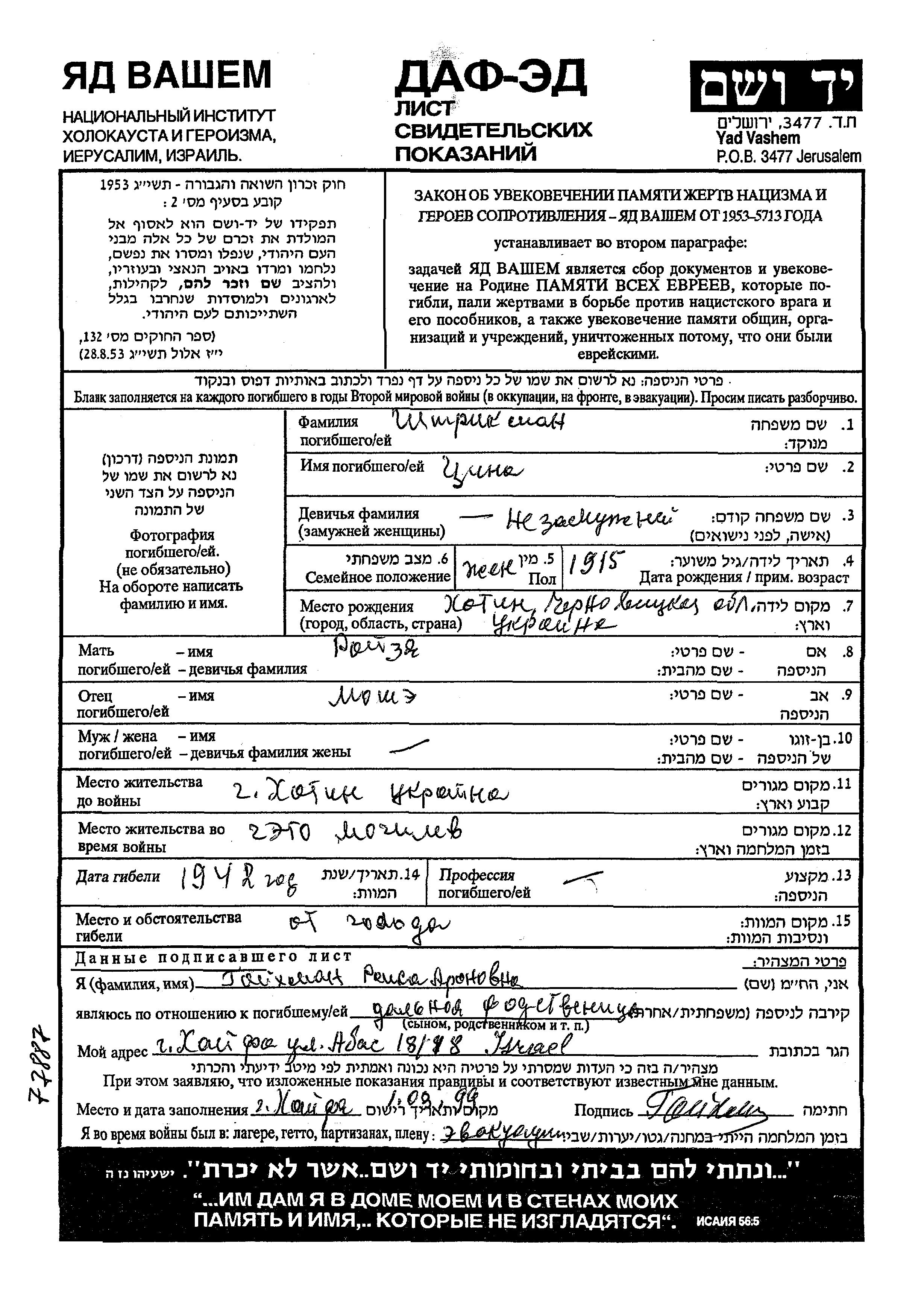 Yad Vashem - Pages of Testimony Names Memorial Collection