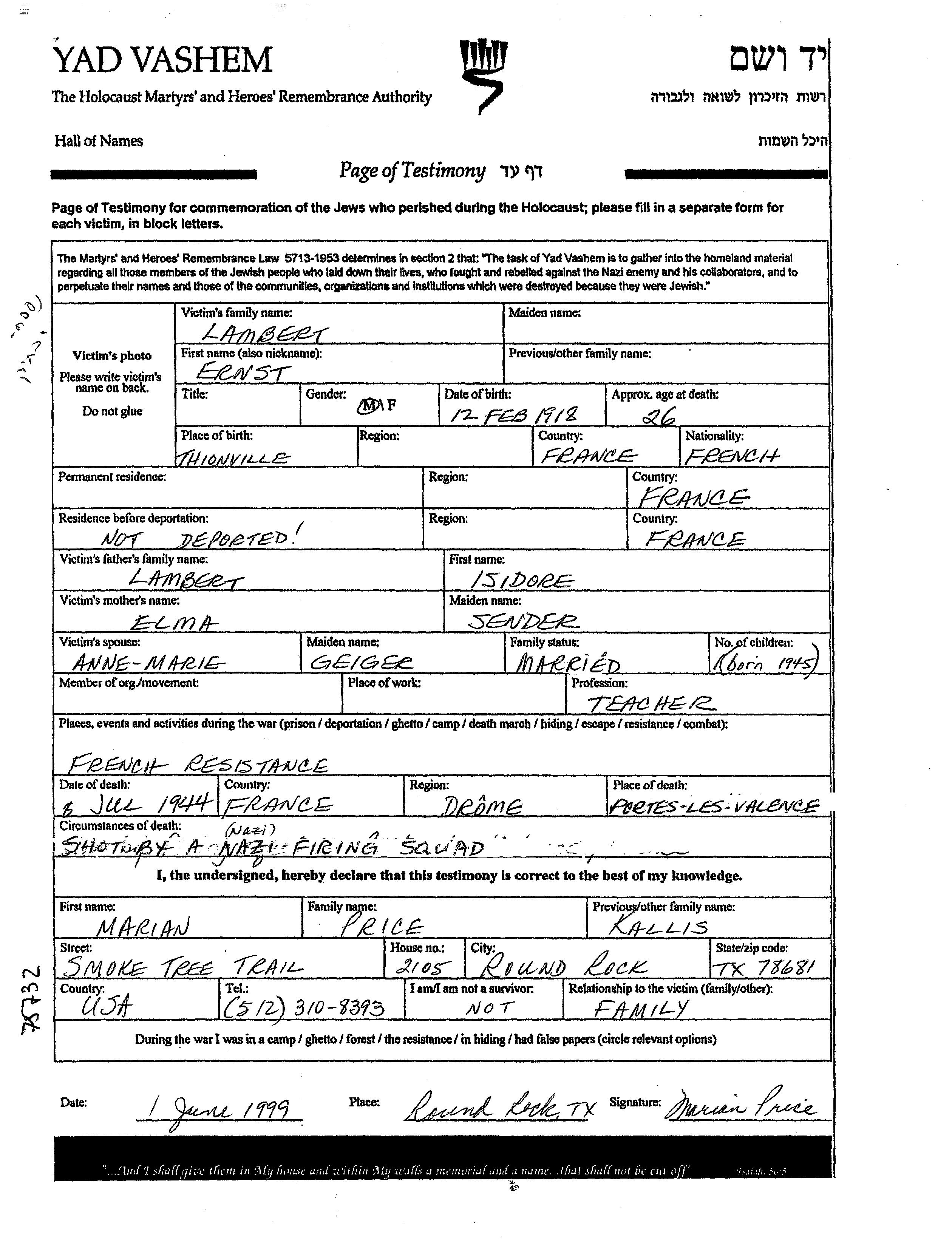 Ernst Lambert est né à Thionville, France en 1918. Il était Enseignant/e. Avant la seconde guerre mondiale il vivait à France.