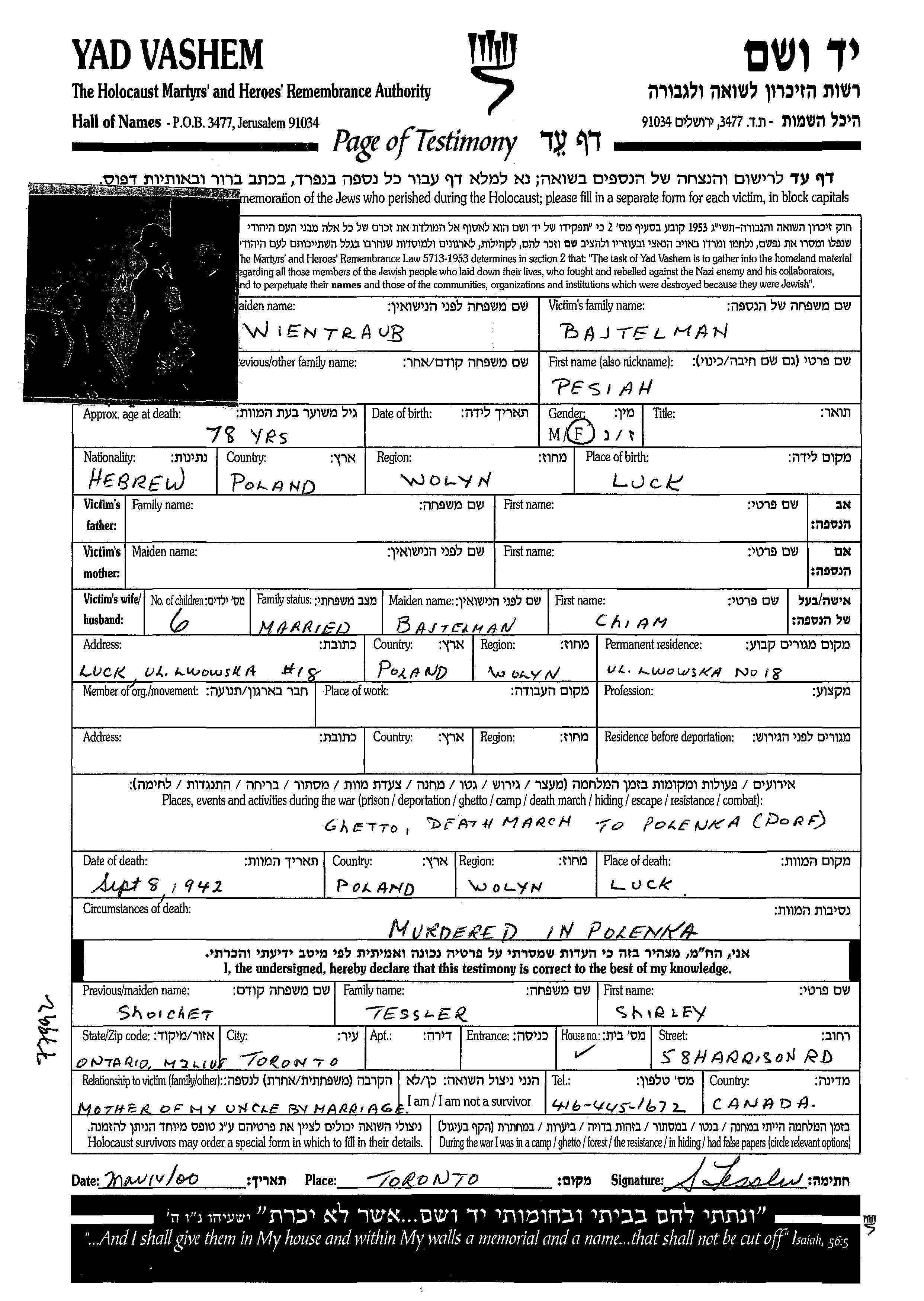 Pesiah Bajtelman née Wientraub est née à Luck, Pologne. Avant la seconde guerre mondiale elle vivait à Luck, Pologne.