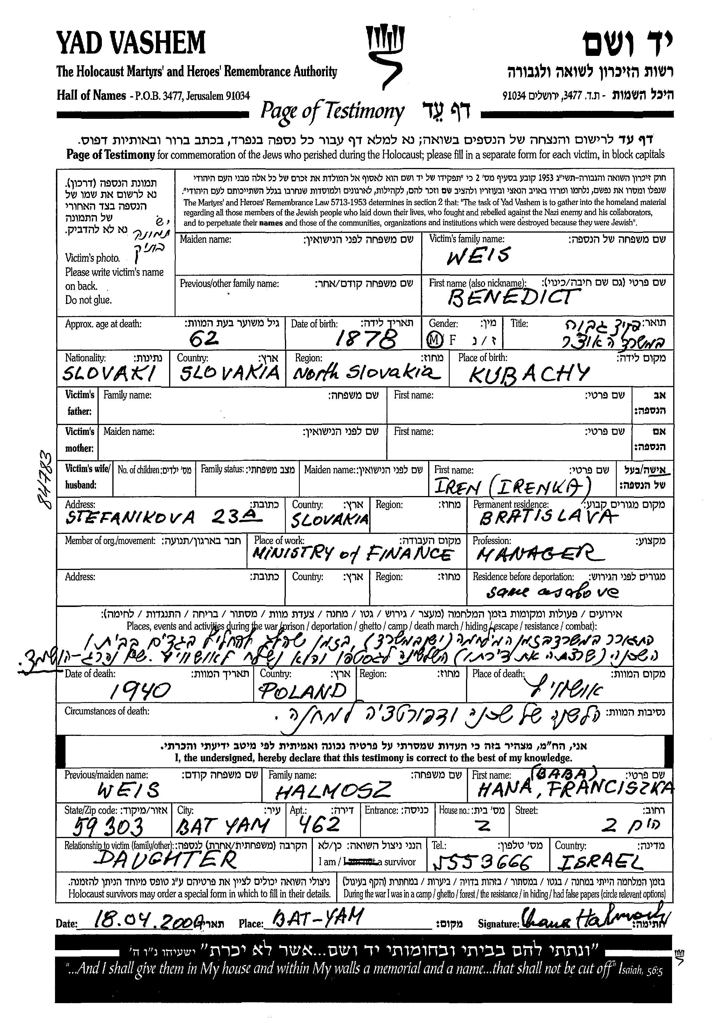 Weis Benedikt 1878 Bratislava, Tchécoslovaquie Feuille de témoignage