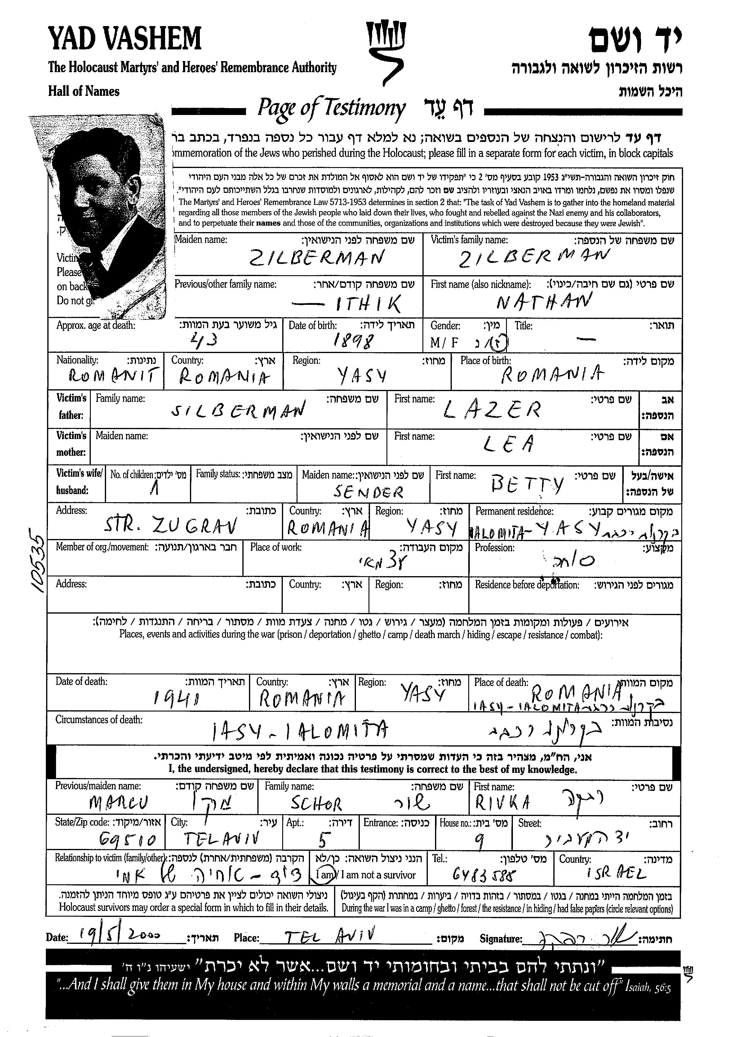 Zilberman Nathan Ithik 1898 Iasi, Roumanie Feuille de témoignage